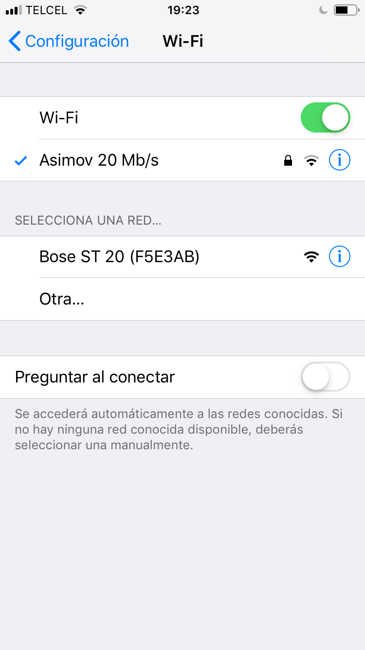 Ve a Configuración > Wi-Fi y asegúrate de que la conexión Wi-Fi esté activada. Toca el nombre de tu red Wi-Fi para conectarte. Si aparece una marca azul al lado del nombre de la red, significa que estás conectado.