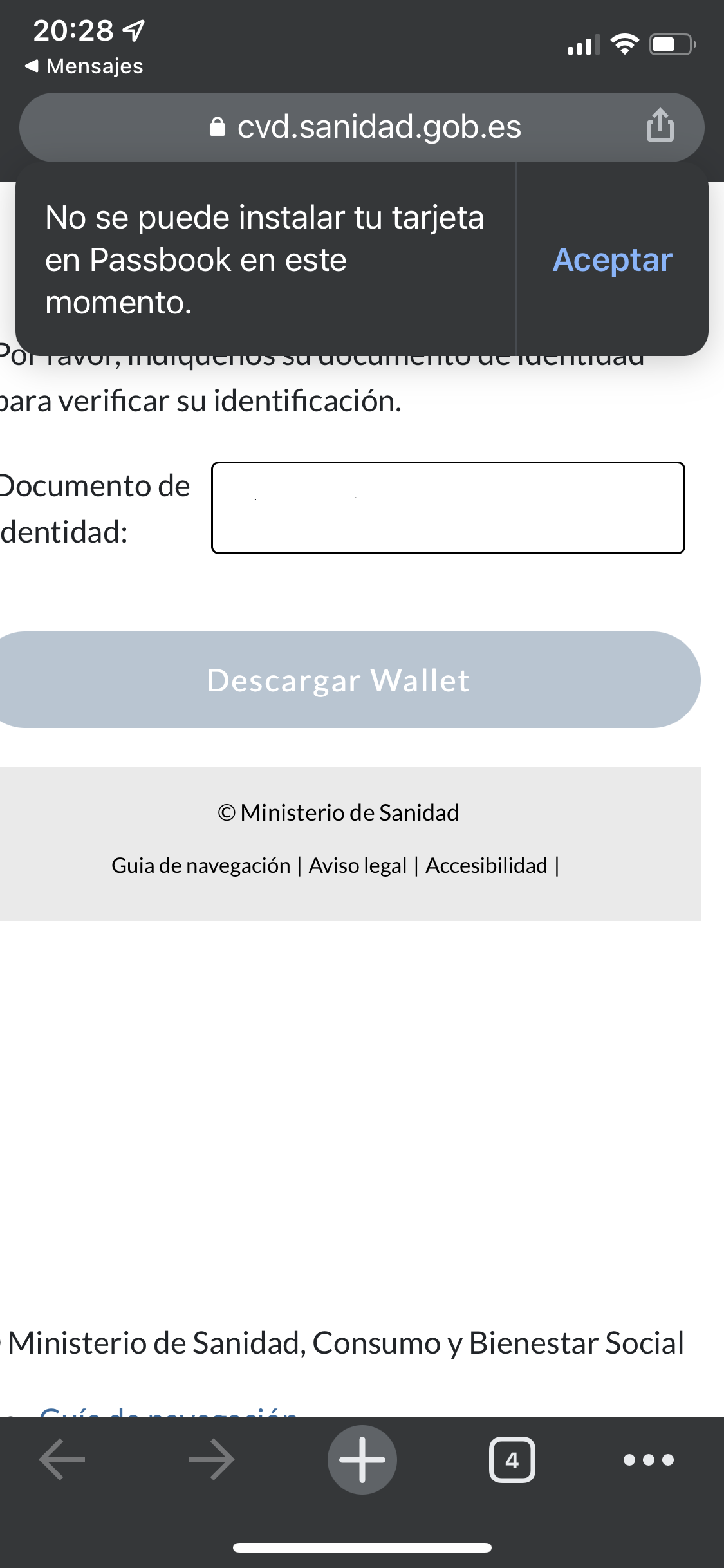 Al intentar descargar el pasaporte Covid con el mensaje que me envia el Ministerio de Sanidad, siempre me da este mensaje de error.