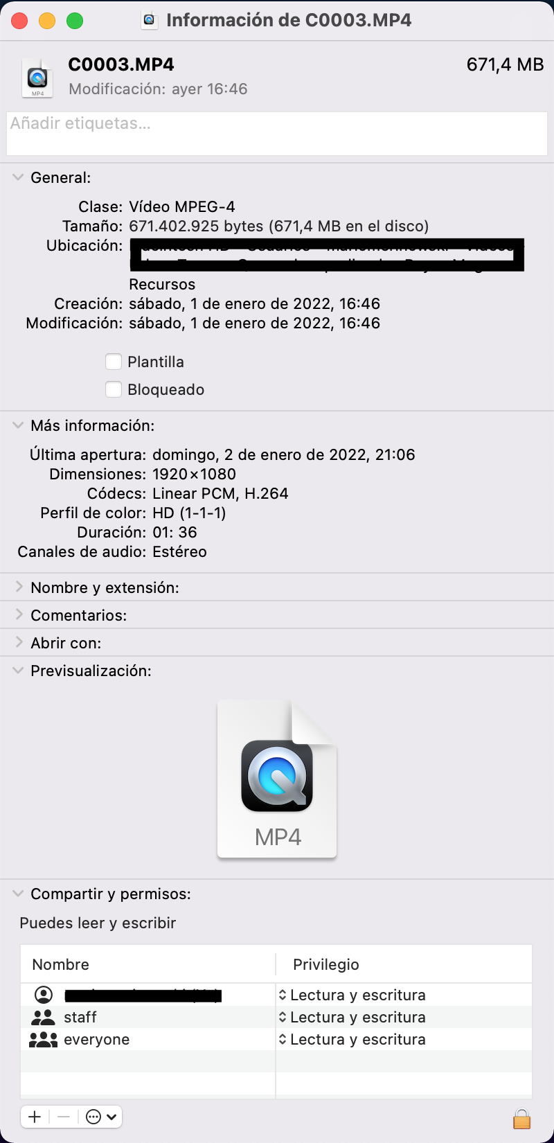 Mi duda es: ¿por qué Quicktime no enseña la miniatura en Finder y no reproduce la preview con la barra espaciadora como hacía antes? Es cierto que he cambiado el submuestreo de color / subsampling a 4:2:2 desde que me pillé la Sony A7IV. ¿Puede ser eso?