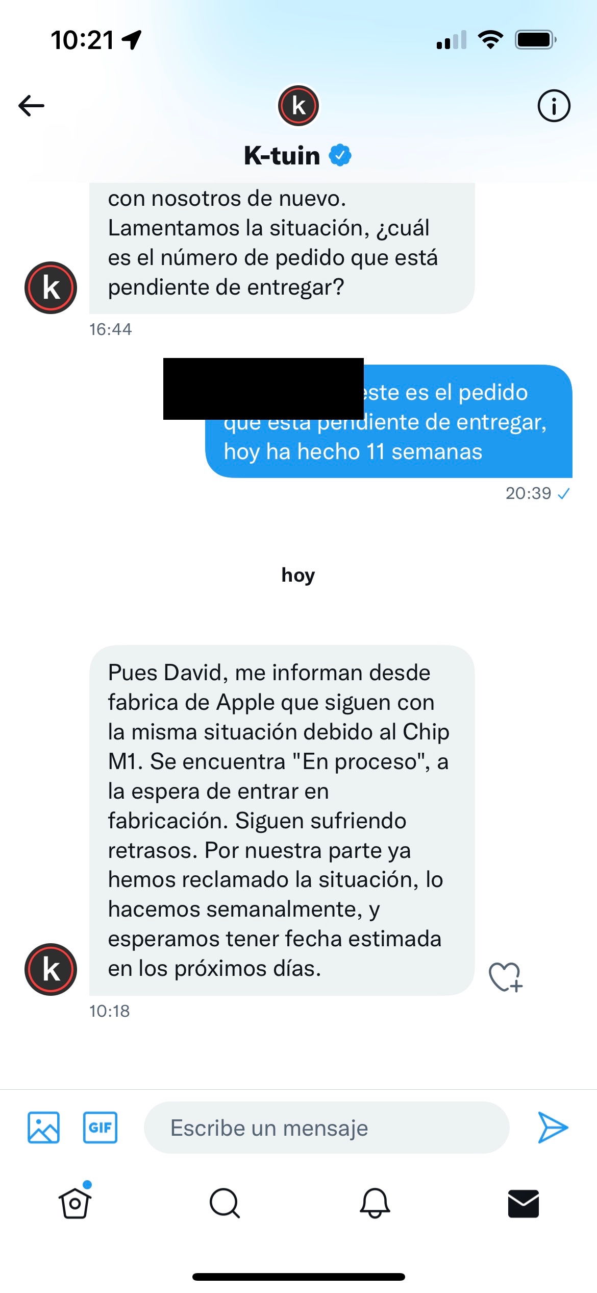 MacBook Pro M1 Max 64 Gb 1Tb comprado en K-Tuin (y, por supuesto, pagado) el 14 de noviembre, han pasado 10 semanas y sin noticias. Todo lo que he sabido del pedido es porque lo he preguntado yo, y las respuestas son estándar y las mismas que a todos los usuarios (que aún no ha entrado en proceso de fabricación, ¡alucinante!).