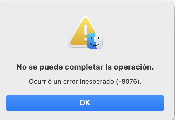 Al mover archivos me aparece frecuentemente este mensaje con un triángulo amarillo con signo de exclamación "!" e icono pequeño del finder. "No se puede completar la operación. Ocurrió un error inesperado (-8076)."
