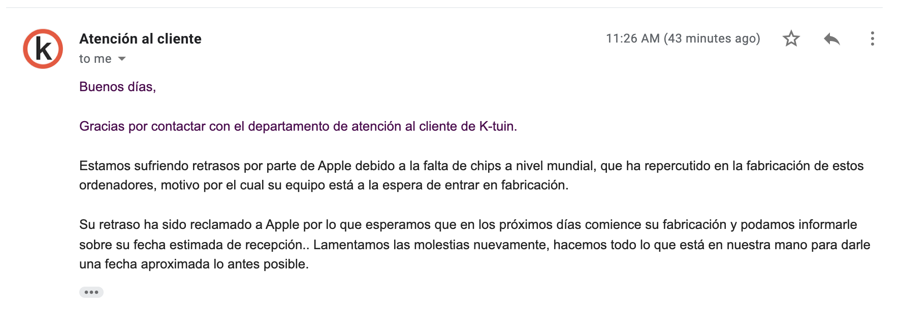 Hola, soy Alberto, el 1 de noviembre de 2021 compré un Mac book pro m1 max, 64 de Ram, 32 núcleos y 2 Tb de almacenamiento. me dicen que de 4-8 semanas la entrega, y van mintiendo en cada contestación, que si en los próximos días, que si está en fabricación (es una respuesta estándar, que está en fabricación puede significar que están extrayendo el paladio de las minas de Servia).
