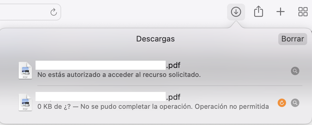 Desde hace unos días, cada que intento descargar un archivo desde Safari sin importar el sitio, no se completa la descarga. En descargas aparece el mensaje 'No estás autorizado para acceder al recurso solicitado' o 'No se puso completa la operación. Operación no permitida'. Cuando efectúo descargas en Chrome no hay ningún problema. Tengo la mitad del espacio de almacenamiento libre.