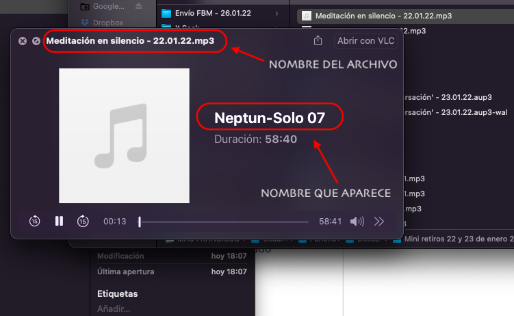 Estoy editando archivos de sonido y si bien cuando los exporto les pongo el nombre de archivo correcto, luego al reproducirlos en VLC, iTunes U otro reproductor, me aparece otro nombre genérico [Neptun-solo 07].