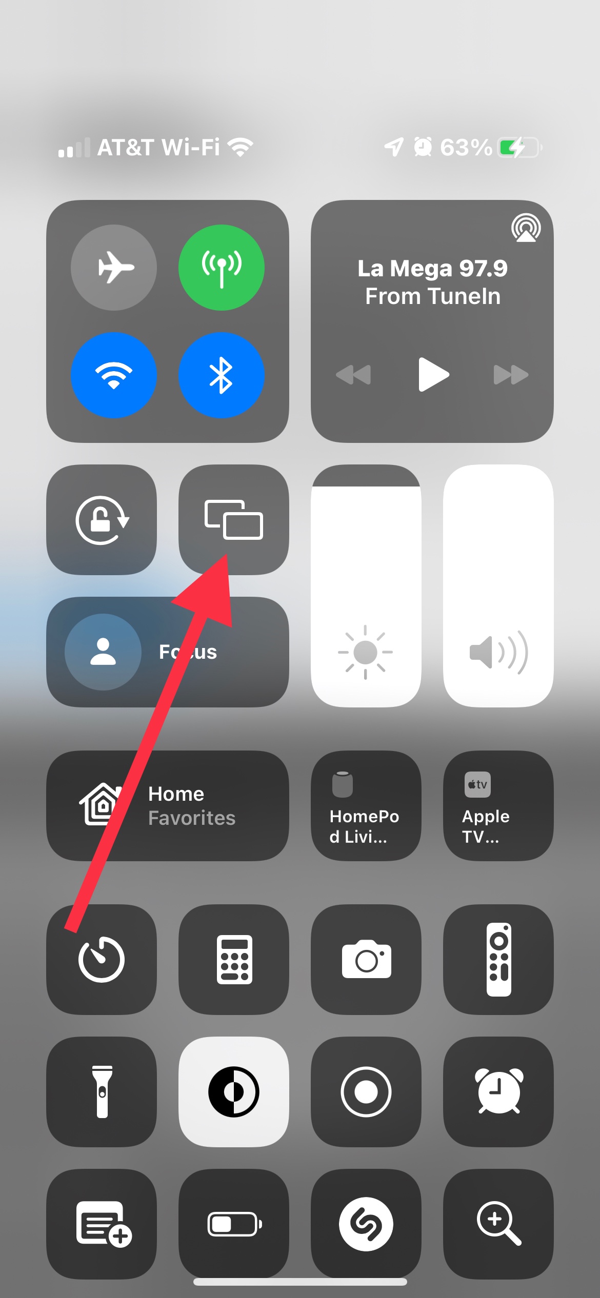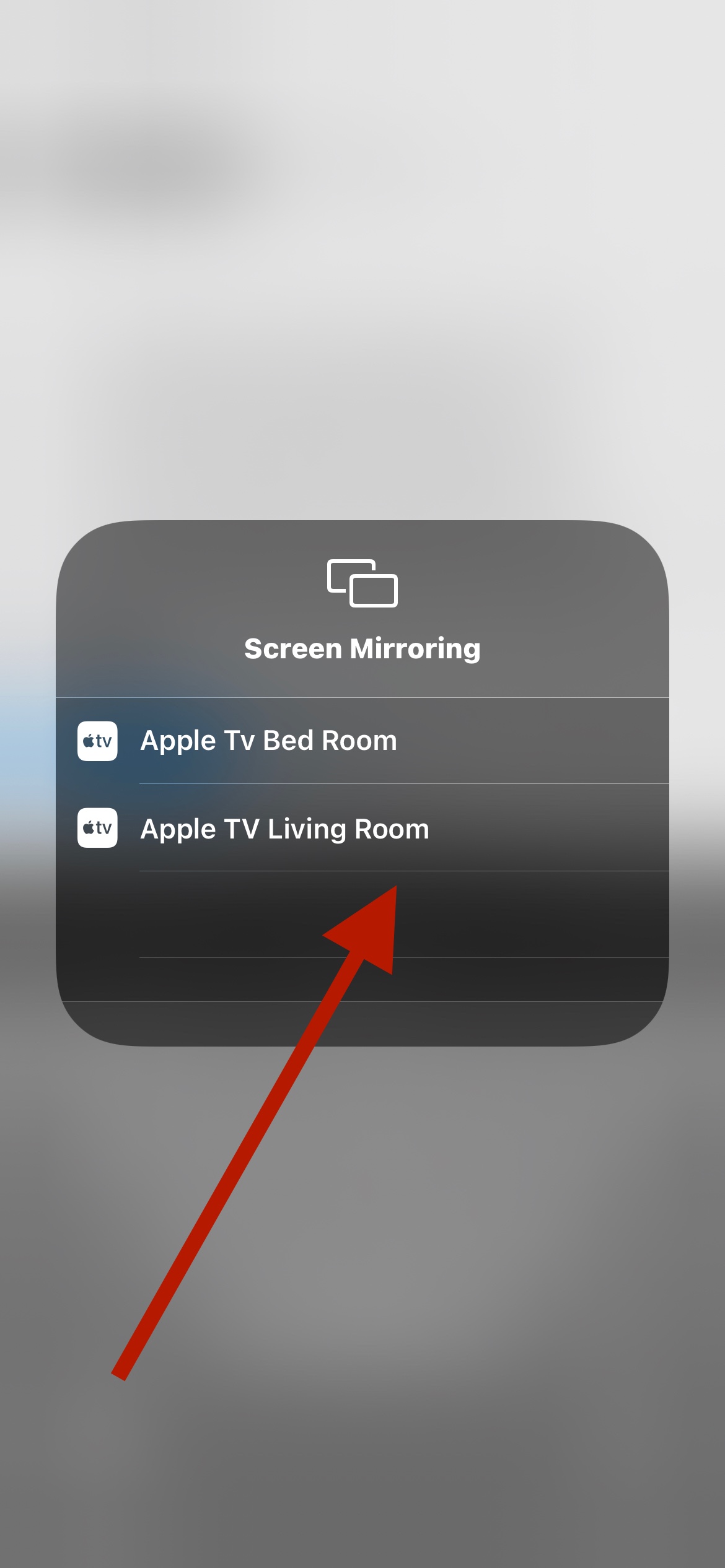 al ingresar ahí buscas la opción de duplicar pantalla tocas con tu dedo y sostienes y te mostrará la lista de tus dispositivos conectados a la misma wifi seleccionando el Apple TV podrá mostrarte el contenido de tu iPhone en tu televisor