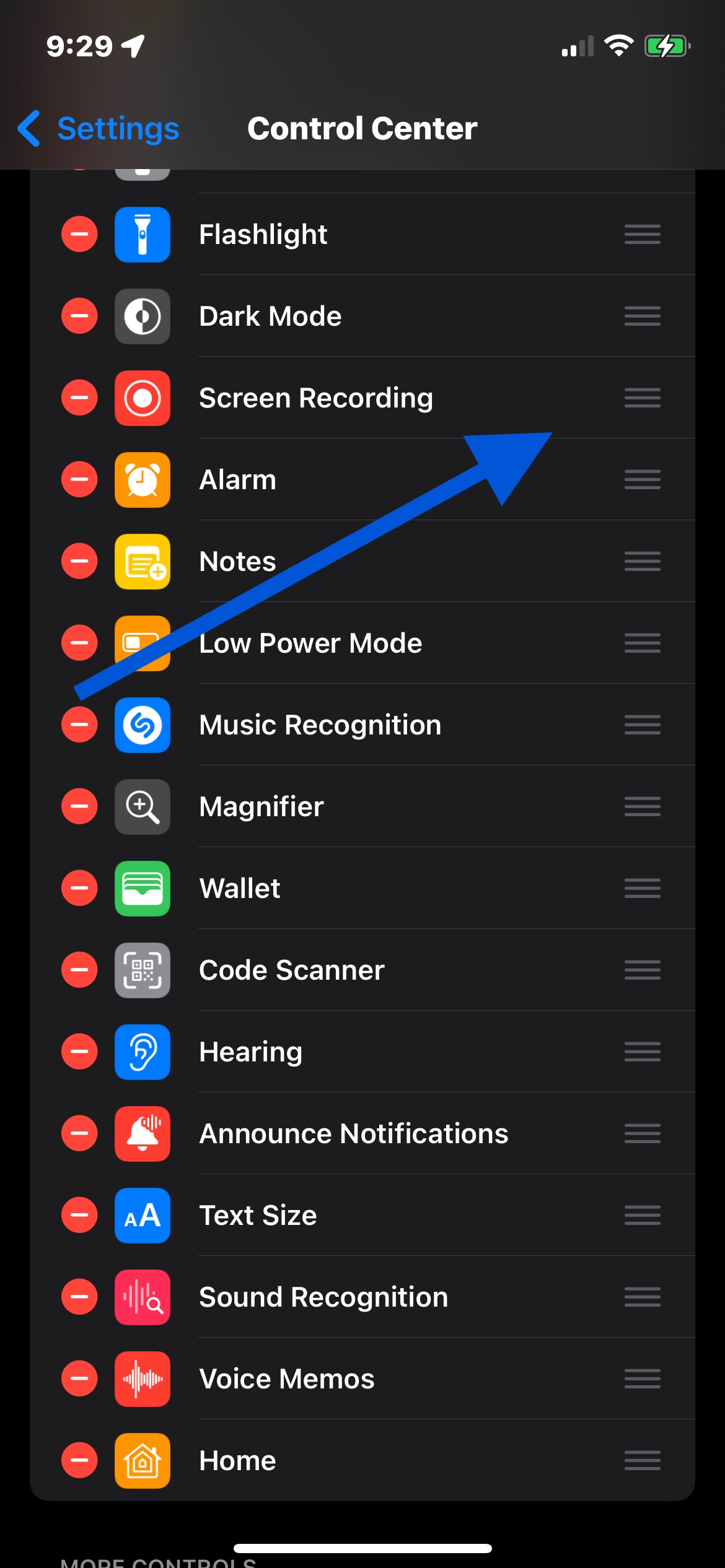 Hola debes agregarla desde configuraciones/centro de control, estará en verde cuando no está agregada y al agregarla ya te aparecerá en rojo