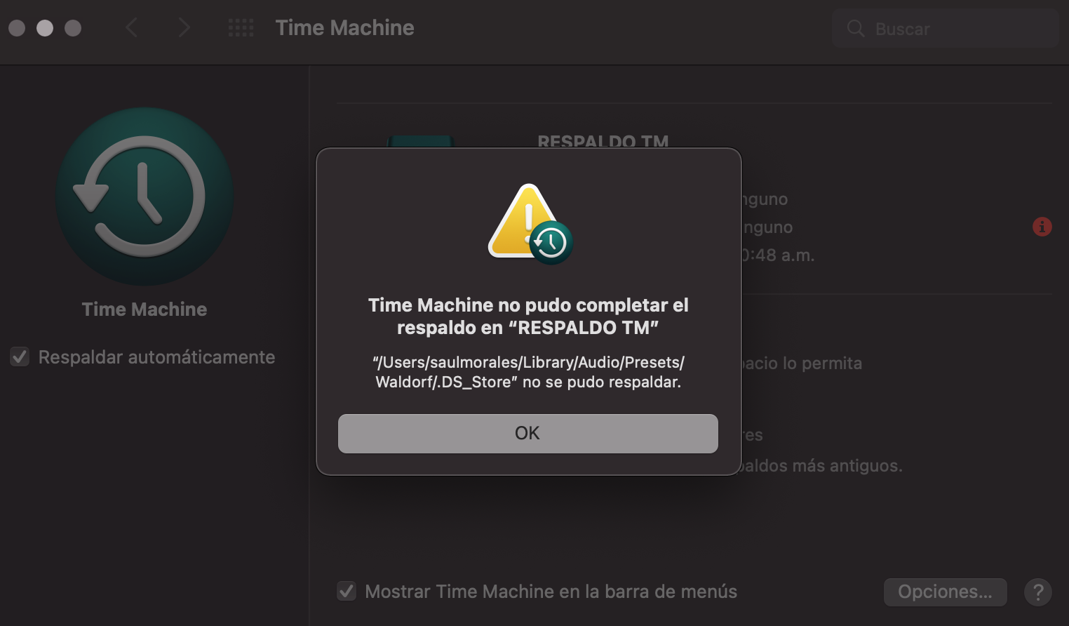 Time Machine NO HACE RESPALDO SOLO POR UN ARCHIVO!