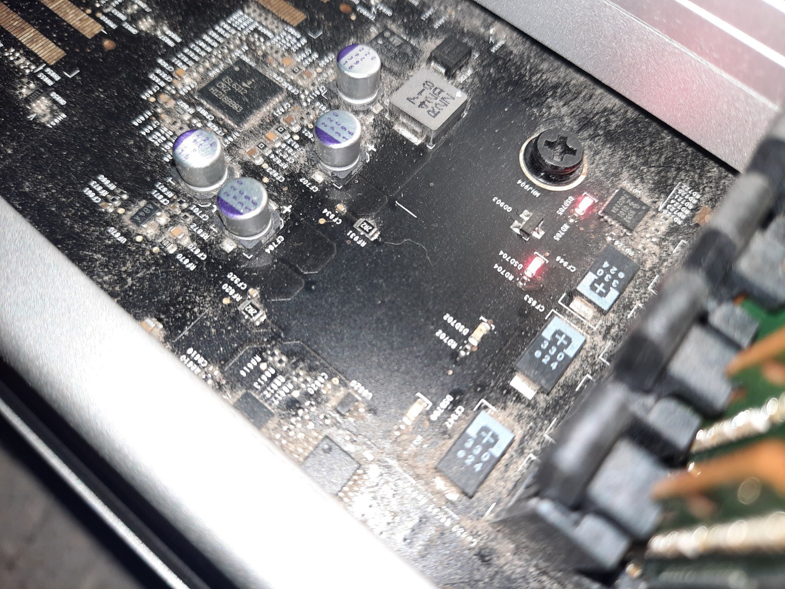 encontre 3 de estos modelos que los iban a desechar, 2 de doble procesador y el otro de 1, uno de los pcs de doble procesador funcionaba, los otros dos tienen el mismo problema, al encenderlos no da imagen, el teclado no enciende ni el ratón, y el tipico sonidito que hace al encender se repite una y otra vez indefinidamente hasta que lo apague, ya les saque las ram, las probe una a una, verifique si estaba sucio, verifique la pila de la placa, verifique los discos sata, la unidad optica y todo parece estar bien. Hay unas luces led que son de color rojo en la placa donde se ubican los procesadores, no se si tenga que ver con lo que pasa pero les dejare captura de ellas... ah por cierto, tambien trate intercambiando la bandeja de los procesadores al otro mac a ver si era la placa del chasis pero seguia igual. la foto donde salen los puertos ram es de la que tiene dos procesadores y la otra que sale como sucia es la que tiene 1 procesador
