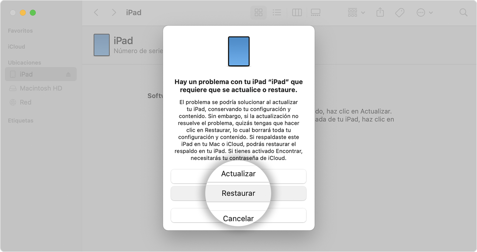 Busca el iPad en el Finder o en iTunes en la computadora a la que está conectado. (Obtén información sobre cómo Buscar y ver un dispositivo conectado en la computadora - Cuando veas la opción de restaurar o actualizar, selecciona Restaurar. La computadora descargará el software para el iPad e iniciará el proceso de restauración. Si la descarga tarda más de 15 minutos y el dispositivo se sale de la pantalla de modo de recuperación, espera a que la descarga finalice, ,apaga el iPad ,y comienza nuevamente