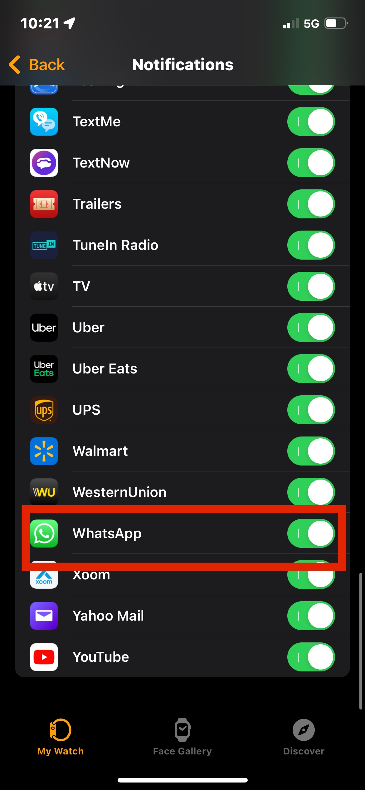 Abre la app watch y verifica que esté activada las notificaciones para WhatsApp