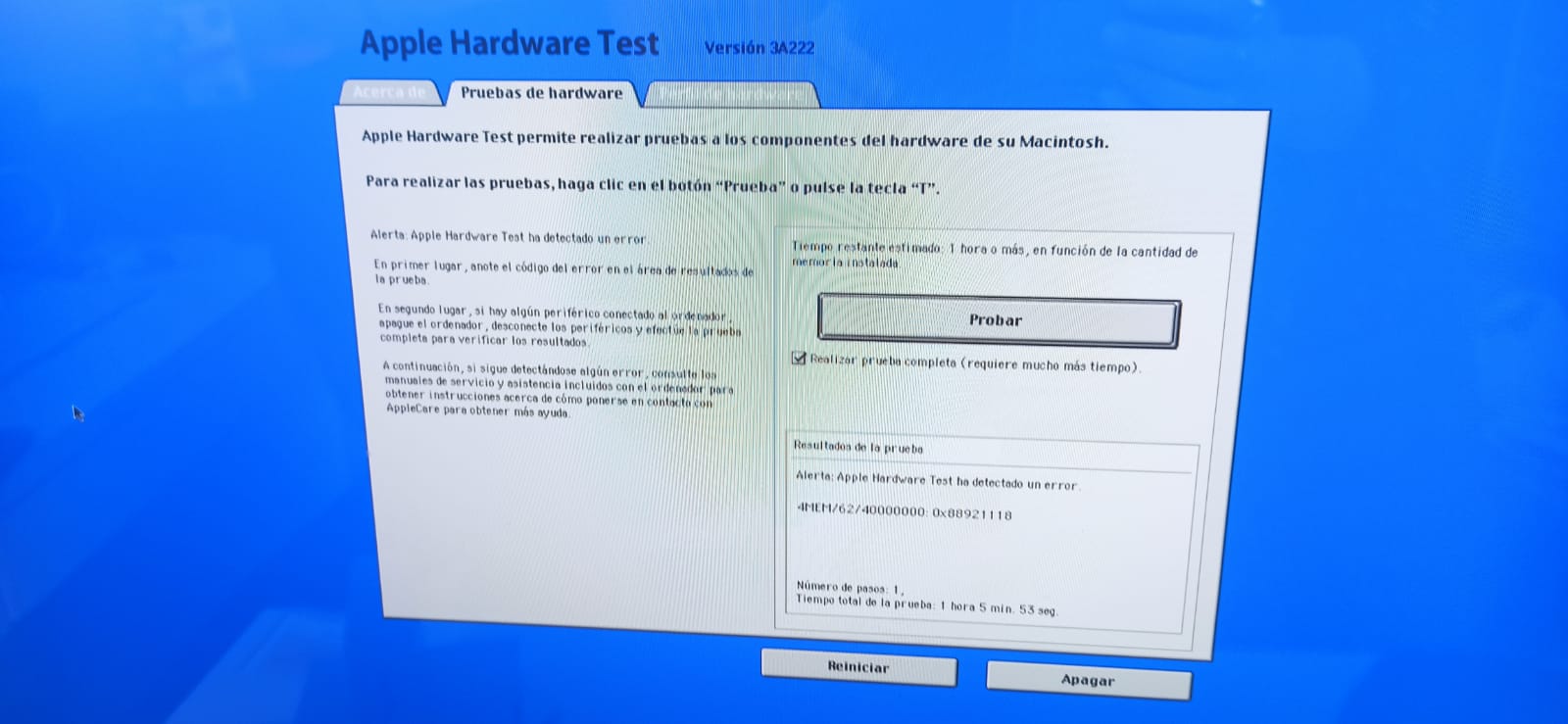 hay una página de Apple con algunos de los códigos que salen en las pruebas de diagnóstico, pero no coincide: