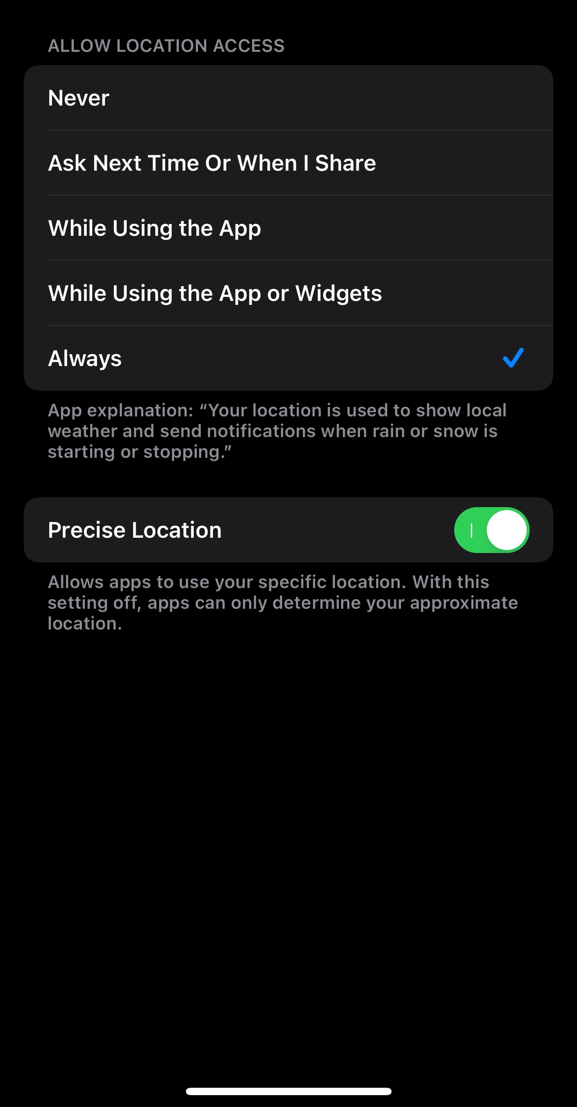 En efecto, así tengo configurado. Me he dado cuenta de que ha sido a raíz de la última actualización. Cuando quiero informar a Apple desde la app tiempo, me da un mensaje de localización no activa. Algo extraño cuando tengo todo activado de forma correcta y positiva.