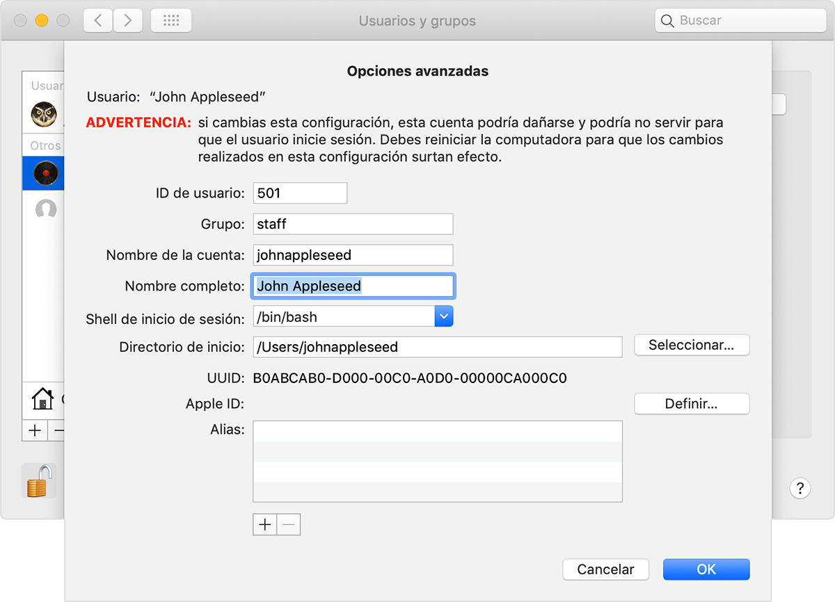 La primera forma sería la de cambiar la ubicación de la carpeta de usuario a ese otro disco. Para ello, cierra la sesión de la cuenta a la que deseas mover la carpeta de inicio y luego inicia sesión en una cuenta de administrador diferente. (Si no tienes otra cuenta de administrador, puedes crear una en las preferencias de Usuarios y grupos).