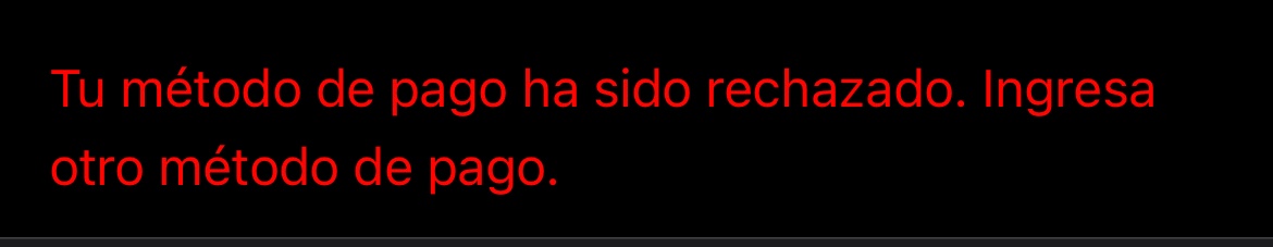 En el siguiente enlace encontrarás algunos pasos a seguir Si rechazan tu método de pago en App Store o iTunes Store.