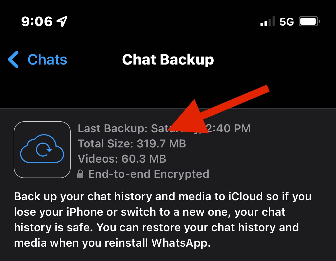 me salía un mensaje última copia de seguridad año 2019, ahora me sale ultima copia de seguridad: nunca, tamaño total:-, videos: 10.06gb en mi iphone 13 aún no habilito el whatsapp porque aún no soluciono la copia de seguridad y no quisiera perder la información.