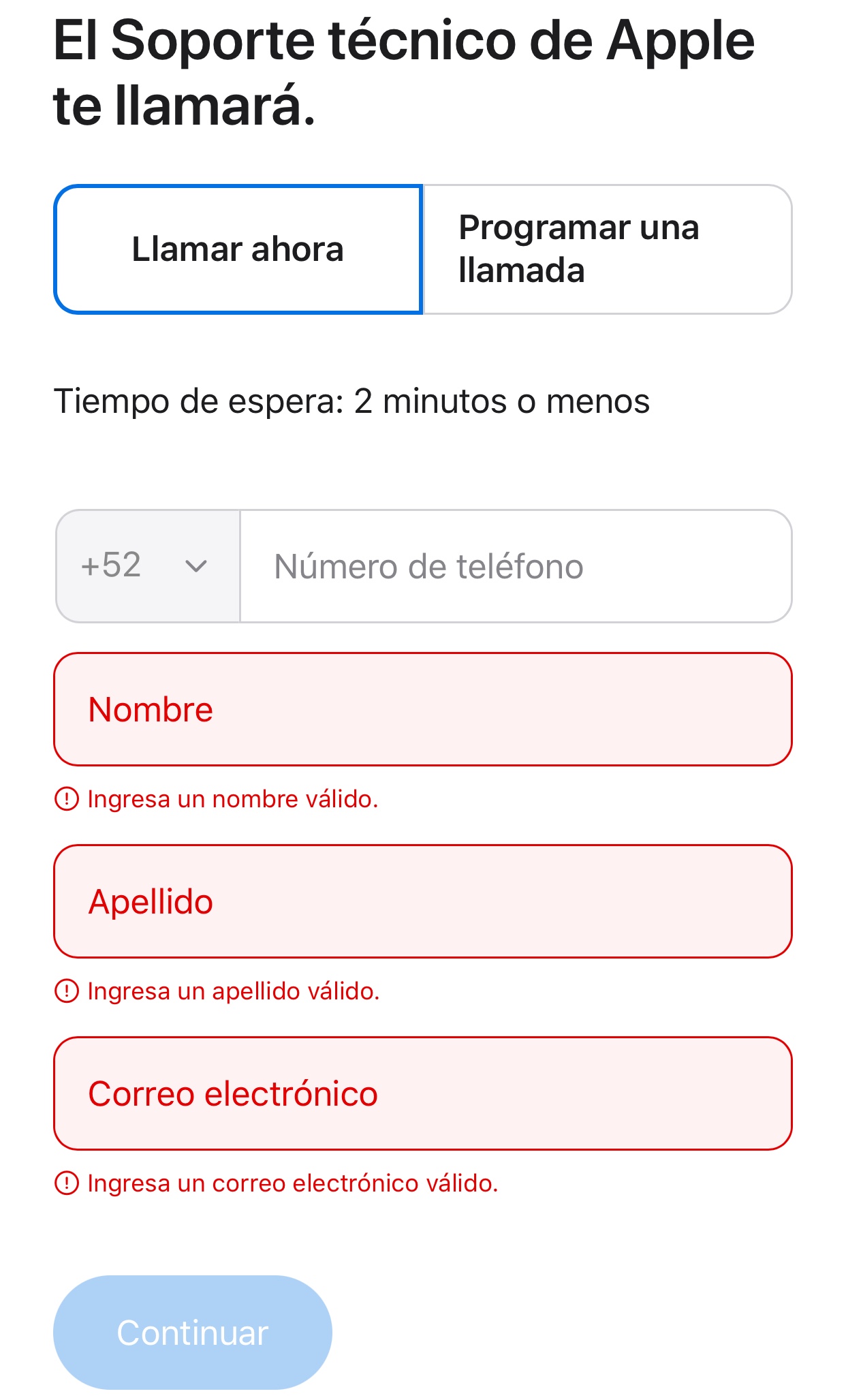 Si ves este mensaje, no edites ningún dato de la cuenta. En su lugar, comunícate con el Soporte técnico de Apple para obtener ayuda.