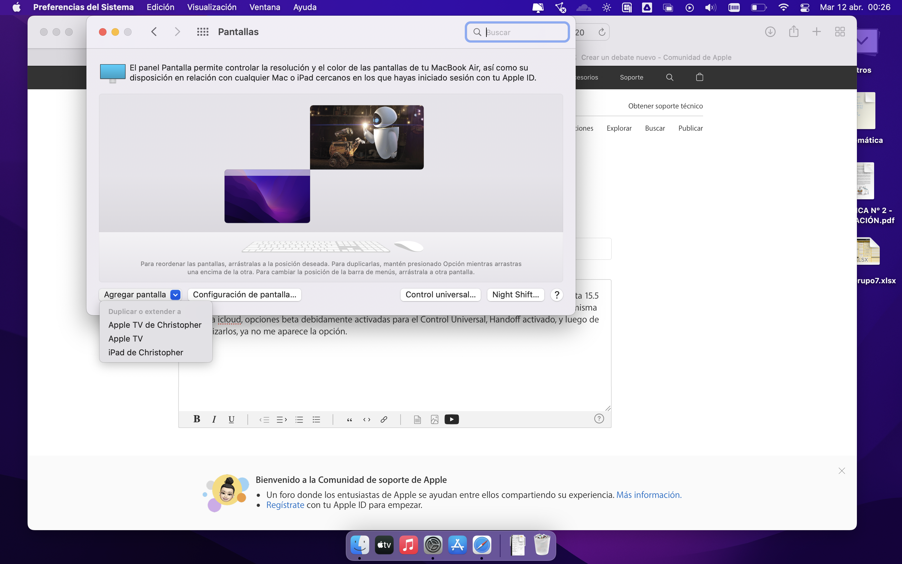 Actualicé mi Macbook Air M1 2020 a Monterrey 12.3.1 y el ipad 7ma generación a la ultima versión beta 15.5 (19F5047e) y no funciona el control universal. Están conectados al mismo Wifi, bluetooth encendido, misma cuenta icloud, opciones beta debidamente activadas para el Control Universal, Handoff activado, y luego de actualizarlos, ya no me aparece la opción para el Control Universal.