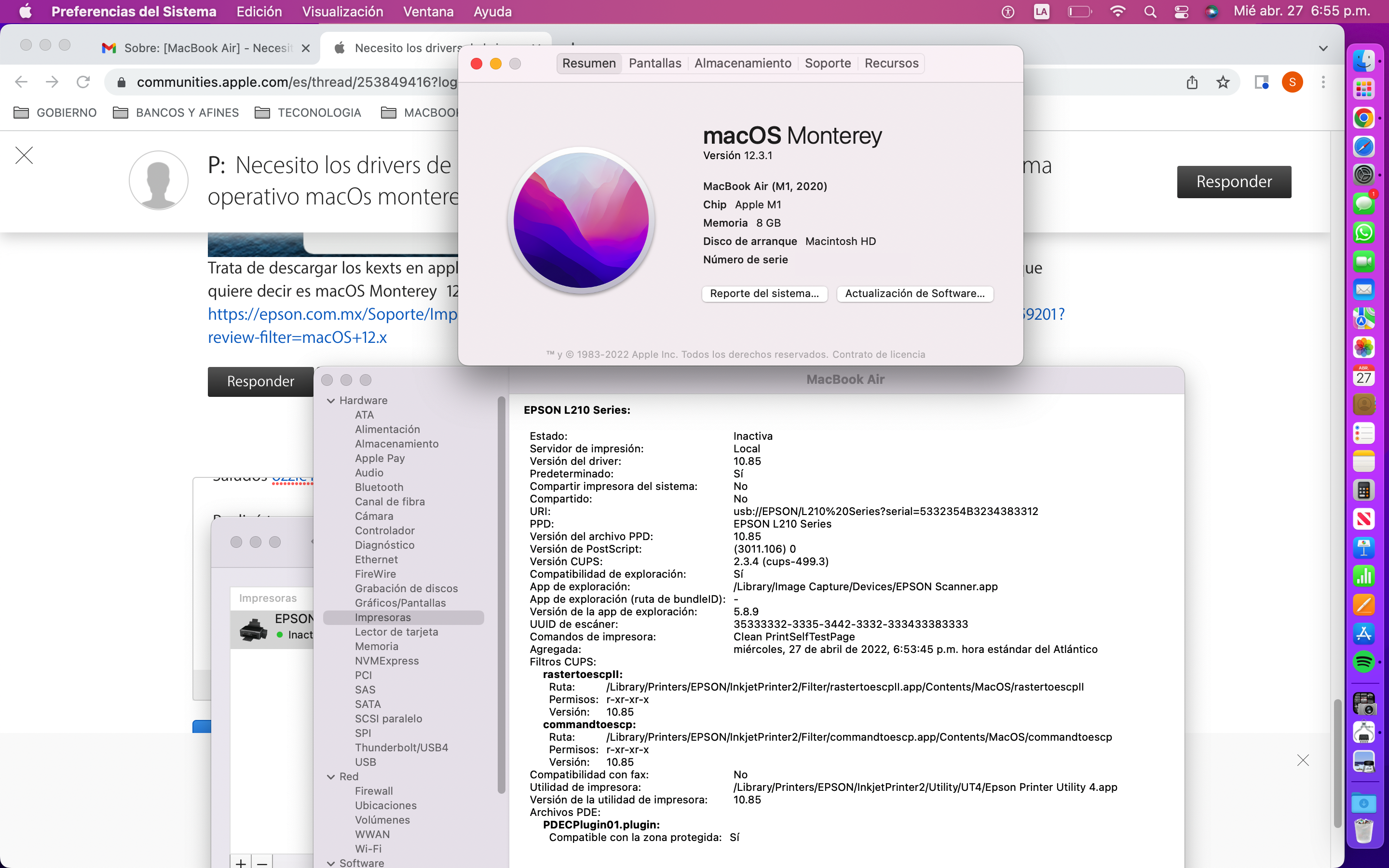 Necesito los drivers de la impresora Epson L210, que sean compatibles con el sistema operativo macOs monterey, versión 12.3.1.