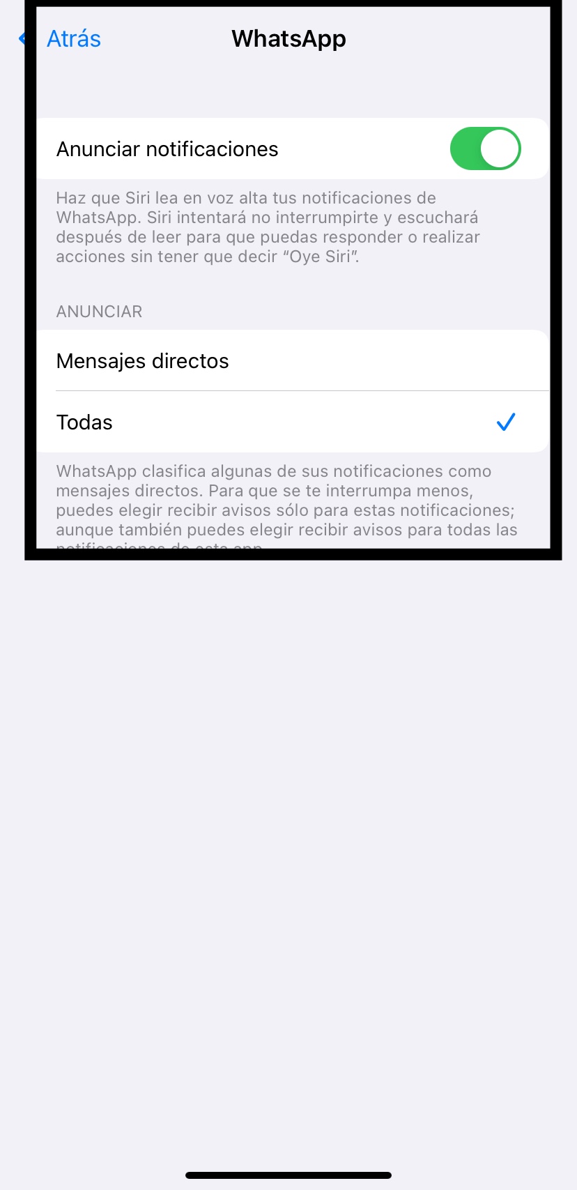 Sí tengo activado todo como muestras en la imagen. Lo que quiero hacer es que Siri pueda hacer llamadas, leer mensajes, etc. en Whatsapp. La orden que doy: "Oye Siri, llama con WhatsApp a ......" o "Oye Siri, enviar mensaje WhatsApp a .........". Me sale el siguiente mensaje: Lo siento, algo no funcuina. Intenta de nuevo.