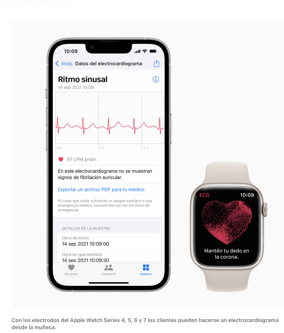 *- El app ECG está disponible en el Apple Watch Series 4 o posterior (no incluye el Apple Watch SE) y requiere la última versión de iOS y watchOS. El app ECG no detecta ataques cardiacos, coágulos sanguíneos, accidentes cerebrovasculares u otros padecimientos relacionados con el corazón, como hipertensión, insuficiencia cardiaca congestiva, colesterol alto u otras formas de arritmia.