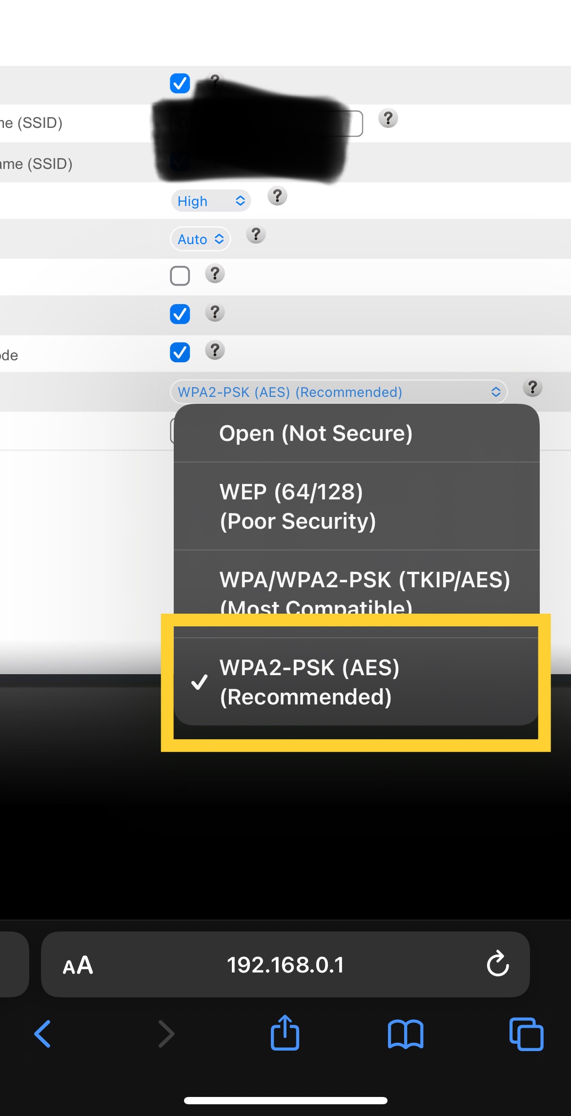 Te explico algo , la configuración de tu modem ya está como decir obsoleto basada en protocolo WPA y ahora es WPA2/WPA3 ellos deben cambiarlo o reemplazar el modem si no tiene compatibilidad con esos protocolos, intenta esto , en tu iPhone ajustes/wifi/ buscas tu wifi y en la (i) puedes ver esto , abre safari y escribes esa dirección no como la mía , la que aparece en tu modem , en safari la abres y si te pide usuario y clave en algunos usan algo simple por ejemplo usuario: admin clave: contraseña, puedo que sea otra pero tratas , y si te permite ingresar buscas este apartado en la configuración de tu wifi mira segunda imagen