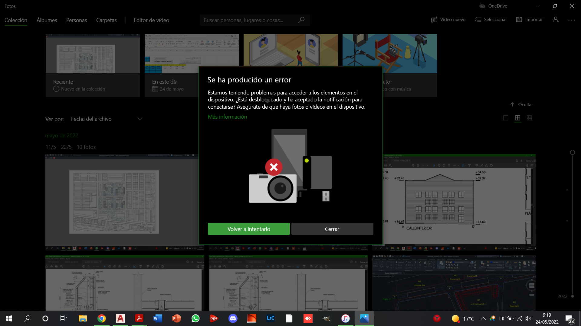 Cuando conecto mi iphone al portátil para transferir las fotos, se abre la aplicación de fotos y sale este error, he probado con diferentes ordenadores, cables y con otro ovil y siempre me sale el mismo error