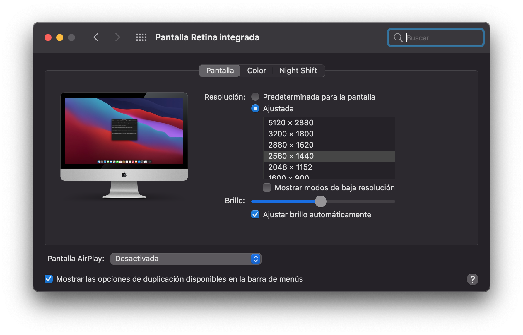 Si tienes un monitor externo conectado a tu Mac, puedes elegir la resolución que ella. Estas resoluciones adicionales para tu pantalla externa las puedes encontrar al mantener presionada la tecla Option mientras seleccionas el botón Ajustada en el panel Pantallas de Preferencias del Sistema. Allí descubrirás si tu monitor acepta dicha resolución.