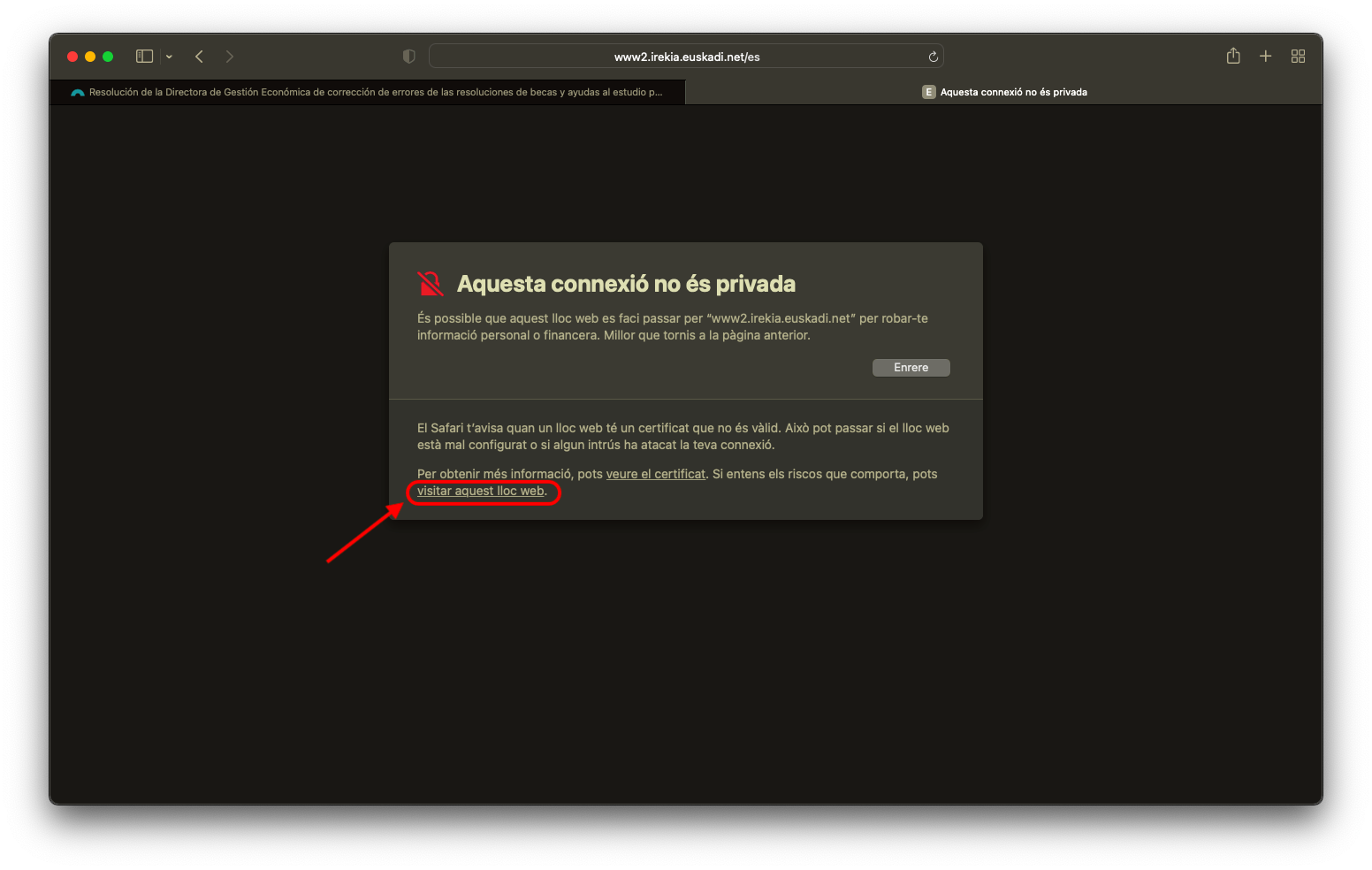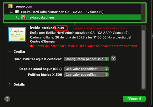 En la segunda está la explicación del problema. El administrador del sitio ha utilizado un certificado expedido para ***.eus, pero la página está en el dominio ***.net.