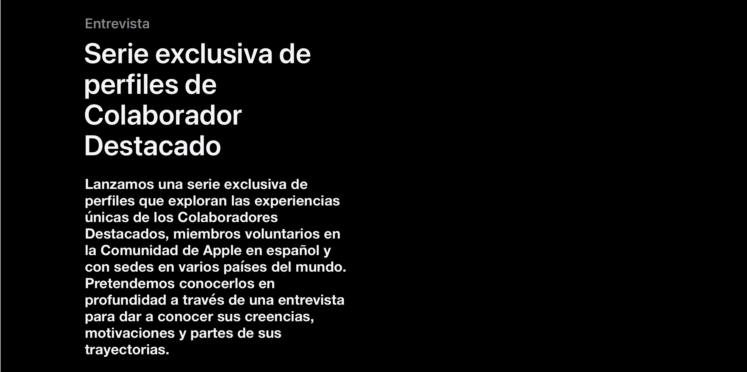 Serie exclusiva de perfiles de Colaborador Destacado. Para más información sobre los Colaboradores Destacados de la Comunidad de Apple visita Colaboradores Destacados.