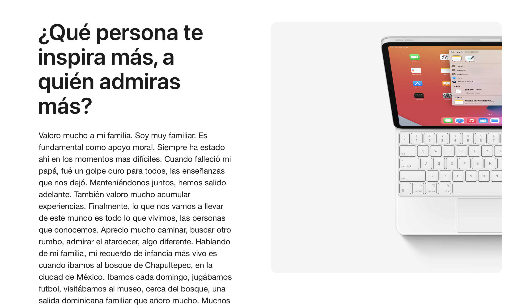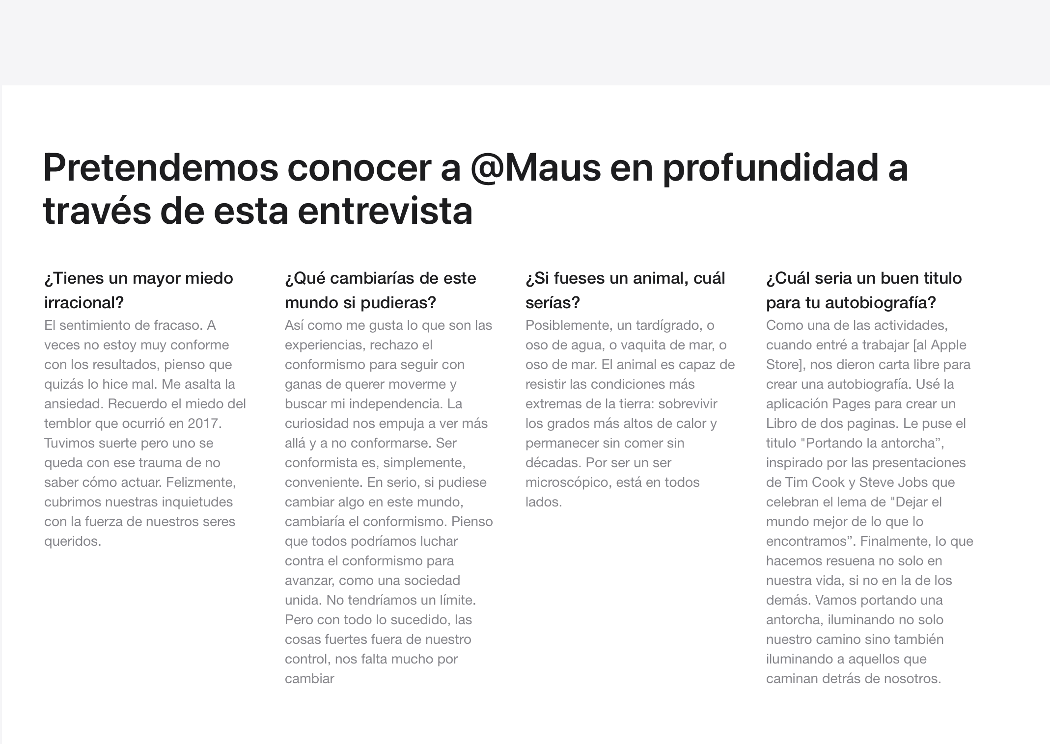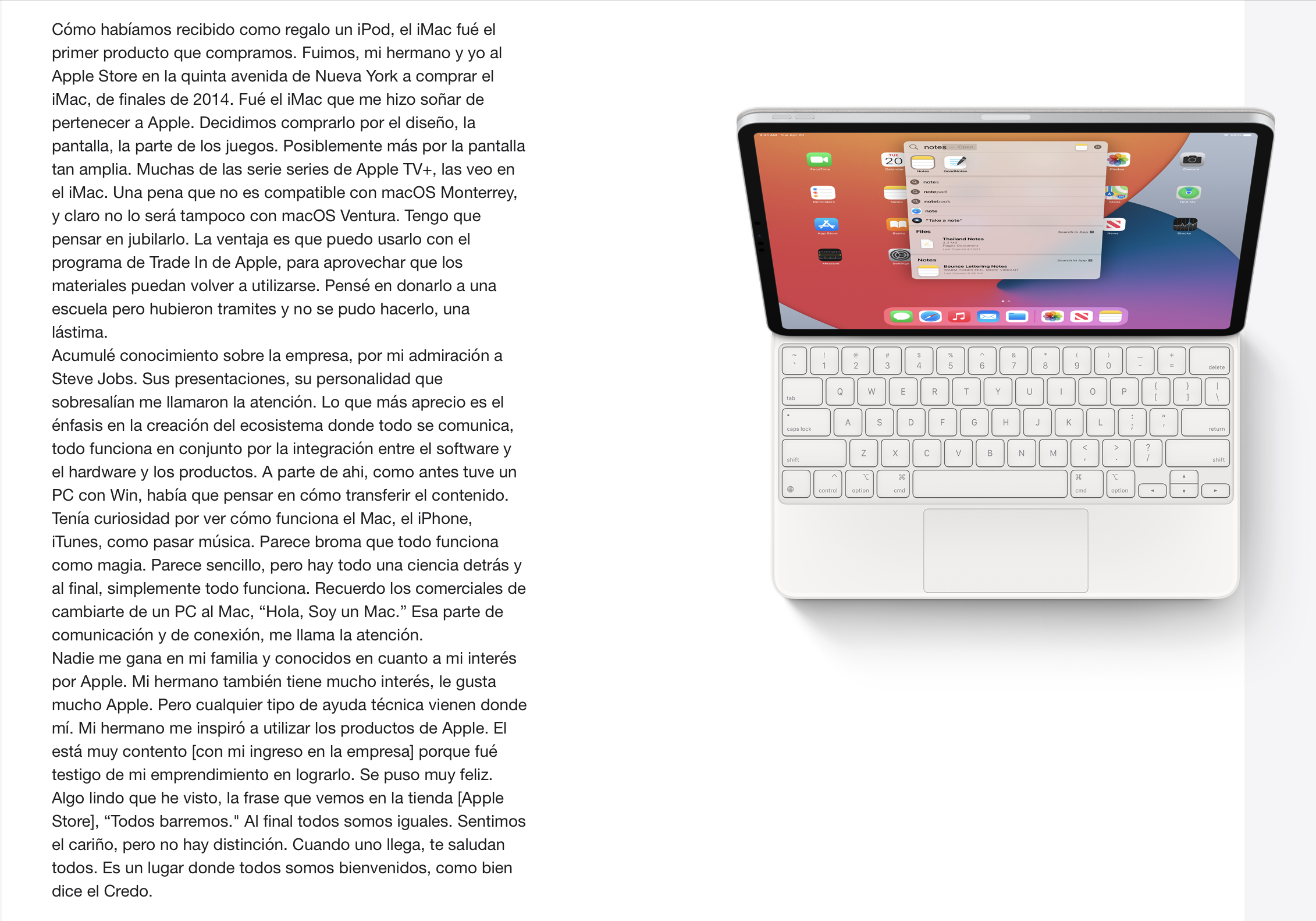 Como una de las actividades, cuando entré a trabajar [al Apple Store], nos dieron carta libre para crear una autobiografía. Usé la aplicación Pages para crear un Libro de dos paginas. Le puse el titulo "Portando la antorcha”, inspirado por las presentaciones de Tim Cook y Steve Jobs que celebran el lema de "Dejar el mundo mejor de lo que lo encontramos”. Finalmente, lo que hacemos resuena no solo en nuestra vida, si no en la de los demás. Vamos portando una antorcha, iluminando no solo nuestro camino sino también iluminando a aquellos que caminan detrás de nosotros.