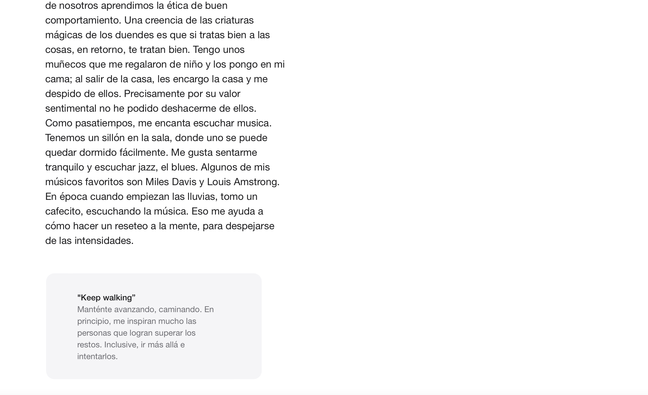 Como pasatiempos, me encanta escuchar musica. Tenemos un sillón en la sala, donde uno se puede quedar dormido fácilmente. Me gusta sentarme tranquilo y escuchar jazz, el blues. Algunos de mis músicos favoritos son Miles Davis y Louis Amstrong. En época cuando empiezan las lluvias, tomo un cafecito, escuchando la música. Eso me ayuda a cómo hacer un reseteo a la mente, para despejarse de las intensidades.