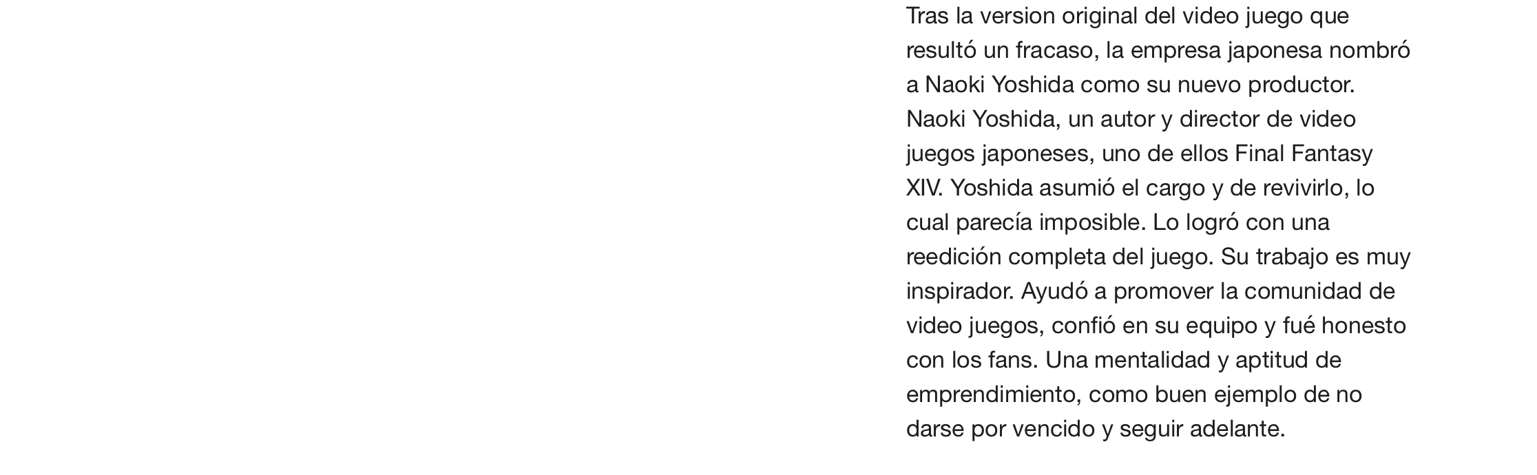 Tras la version original del video juego que resultó un fracaso, la empresa japonesa nombró a Naoki Yoshida como su nuevo productor. Naoki Yoshida es un autor y director de video juegos japoneses, uno de ellos Final Fantasy XIV. Yoshida asumió el cargo de revivirlo, lo cual parecía imposible. Lo logró con una reedición completa del juego. Su trabajo es muy inspirador. Ayudó a promover la comunidad de video juegos, confió en su equipo y fué honesto con los fans. Una mentalidad y aptitud de emprendimiento, como buen ejemplo de no darse por vencido y de seguir adelante.