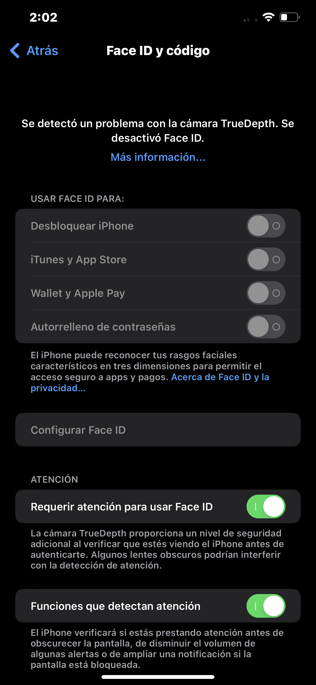Como se arregla el problema de Face ID , si me aparece el error de TrueDepth