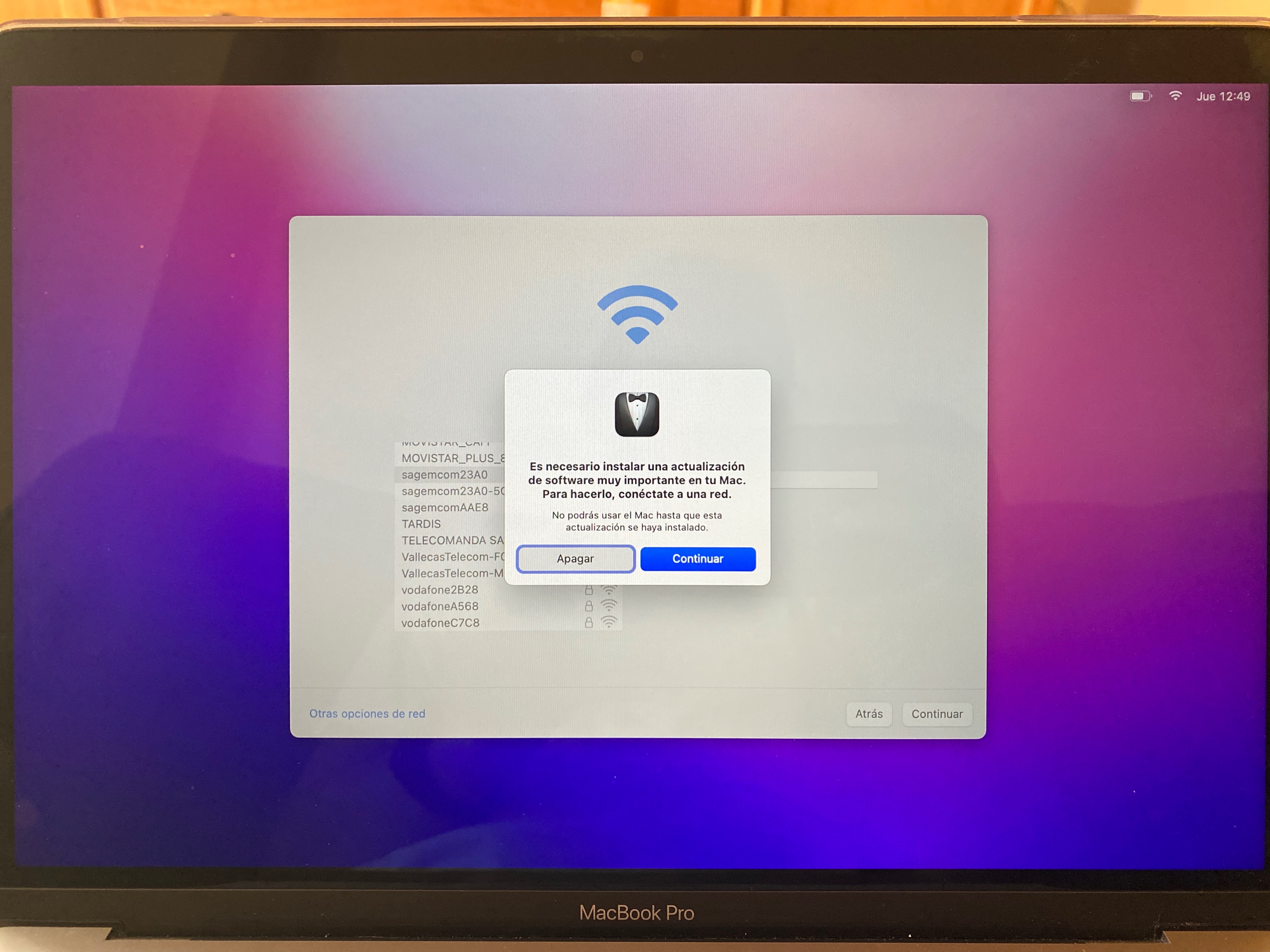 Al ir a desinstalarme un programa, el ordenador ha tenido que reiniciarse. Una vez que se ha vuelto a encender, a empezado en el bucle de tener que conectarme a una red Wi-Fi porque “Es necesario instalar una actualización de software muy importante en tu Mac. Para hacerlo, conéctate a una red. No podrás usar el Mac hasta que esta actualización se haya instalado.”