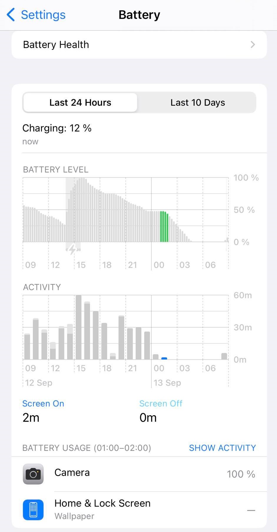 Al inspeccionar en el menu bateria me aparece que a la noche en una hora (entre las 1 am y 2 am que estaba dormido), La camara se uso un 100%, en 1 minuto,
