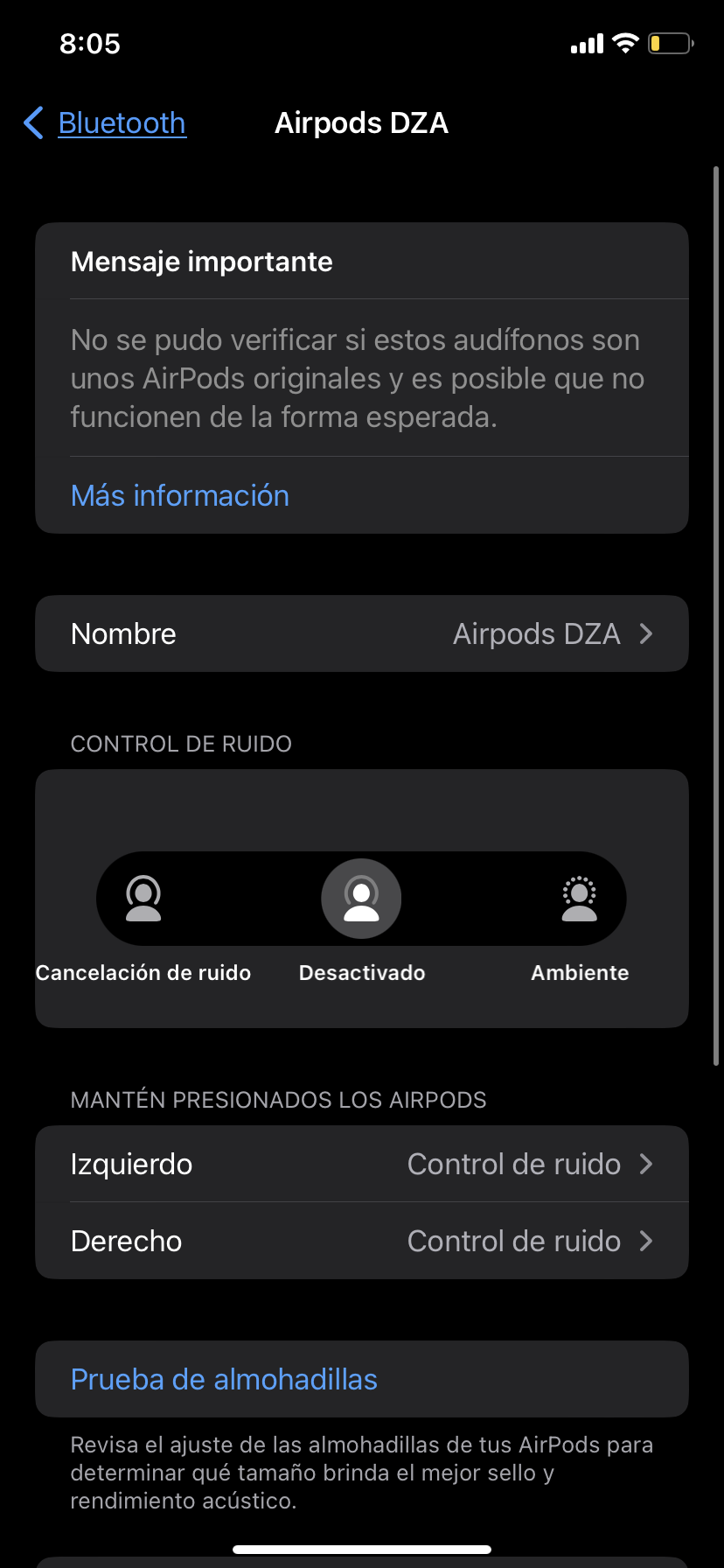 Intenta desenlazar y volver enlazar los AirPods. Esos pasos deben solucionar el problema si son AirPods originales. Este enlace detalla los pasos de enlazar: Enlazar los AirPods (primera, segunda o tercera generación)