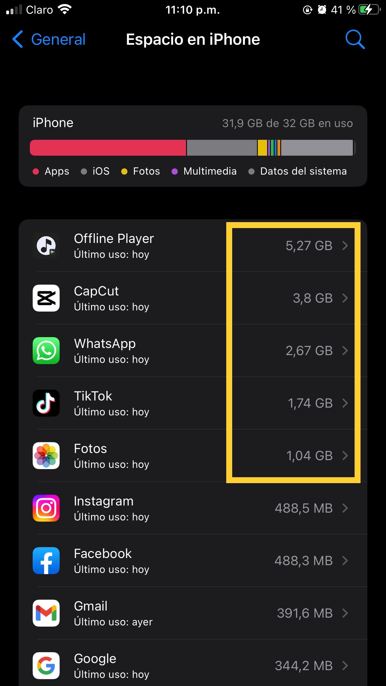 Comprar almacenamiento de iCloud no incrementará el almacenamiento del iPhone porque no son lo mismo , si puedes notar que estás apps están usando mucho espacio del dispositivo alrededor de 13 gigas, deberás eliminar información para liberar espacio de almacenamiento del iPhone