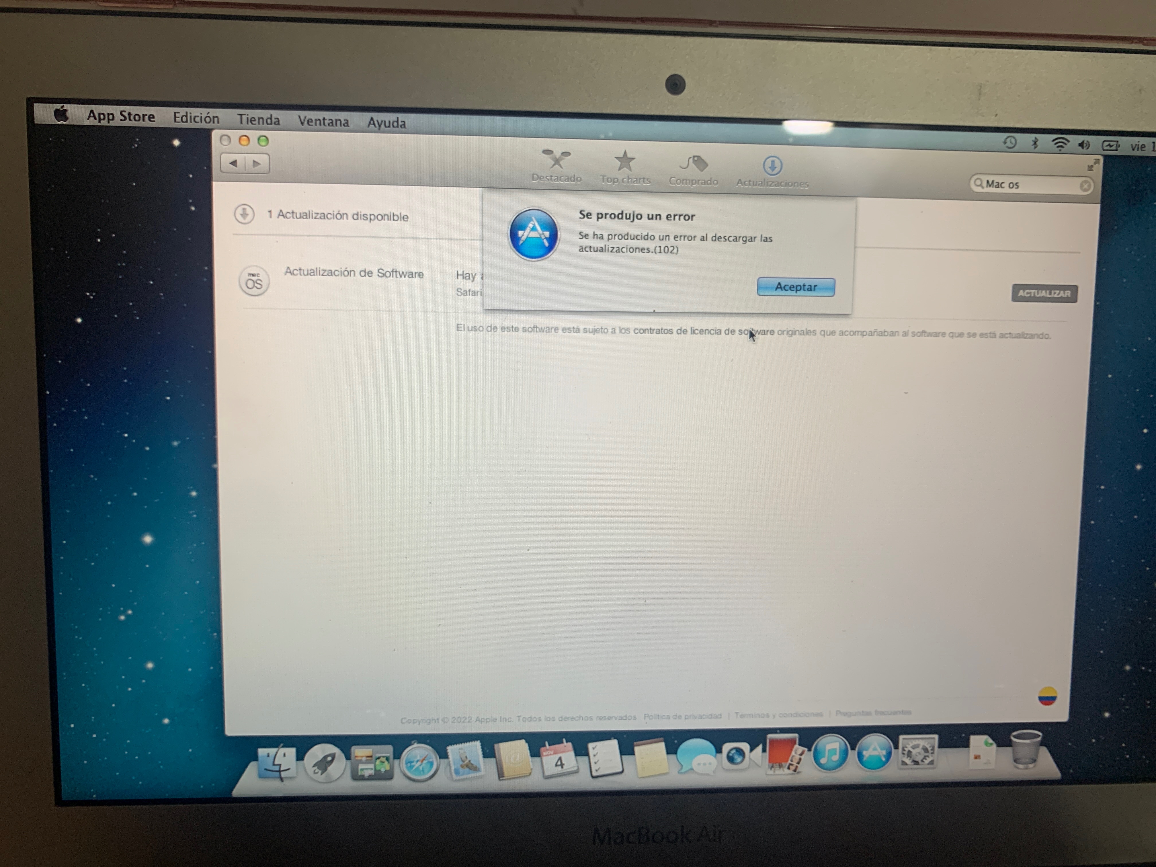 Hola buenas tardes tengo un problema con mi mac air yo la intente formatear sin respaldo ni nada y sin querer borre el disco de arranque con la version mas nueva y me intale la version lion 10.8.5. Y al intentar actualizarla a la mas reciente me aparece el error 102 de actualizacion de software realmente ya no se que hacer necesito ayuda para volver a actualizar mi mac (No me deja navegar en safari)