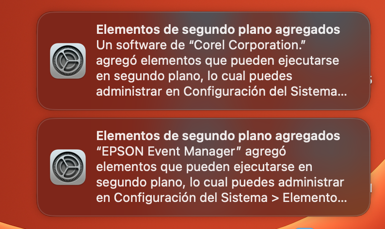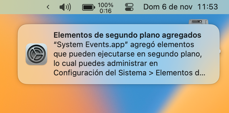 Desde que actualicé a Ventura, cada que inicio sesión aparece esta notificación indicando nuevos elementos con actividad en segundo plano, por una app llamada System Events.app
