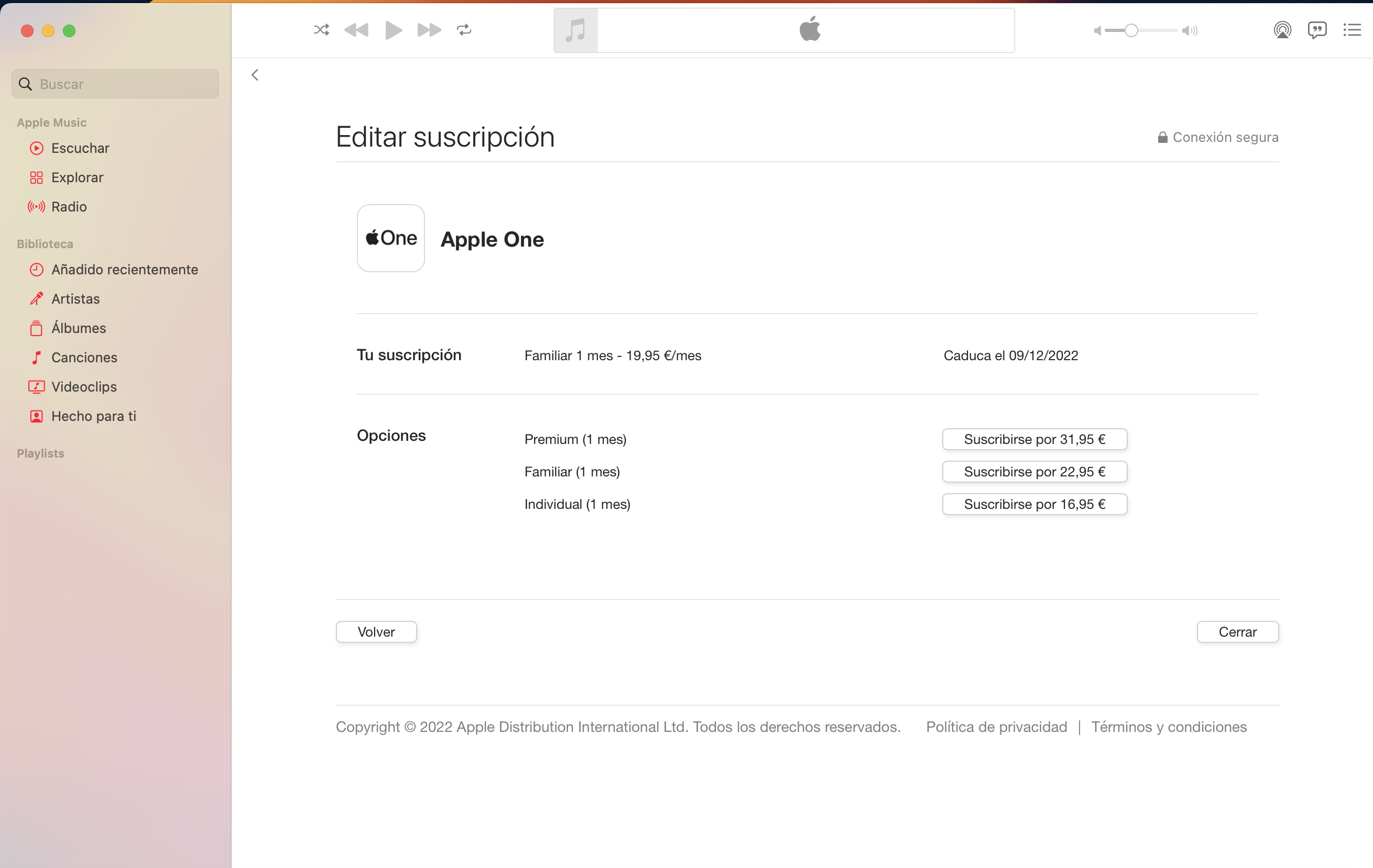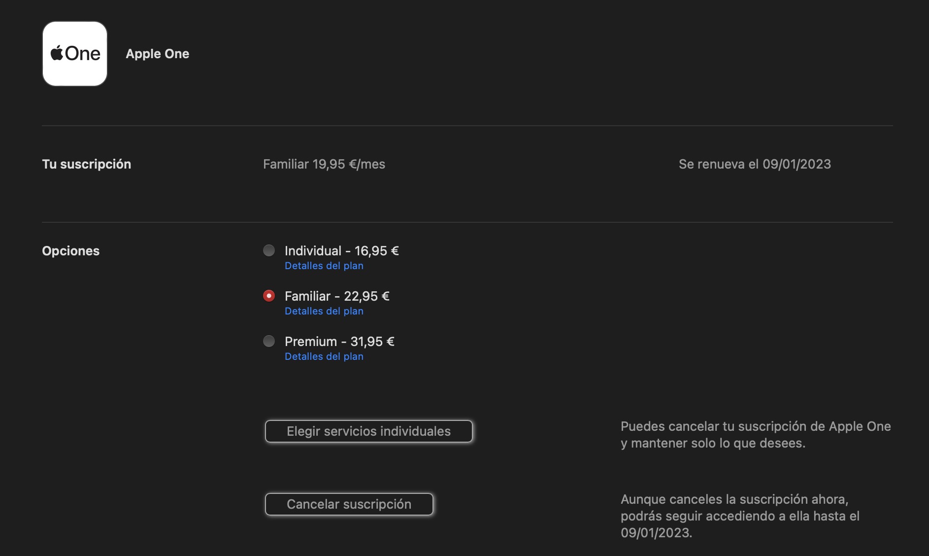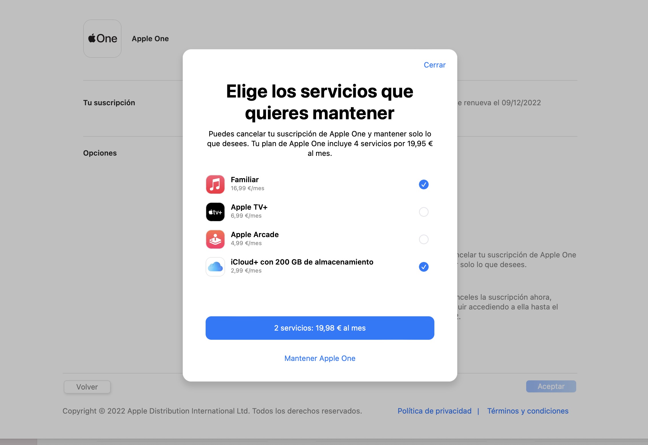 he estado mirando los planes de Apple one familiar, ya que va a subir de precio. pues me salió una opción donde en el plan familiar podía escoger solo lo que me entesaba, es decir Apple music y los 200 gb en la nube, de esta forma, el precio baja algo al no seleccionar el plan familiar entero. cuando he vuelto a esa opción para realizarlo, ahora no me sale para que seleccione lo que yo quiera, es decir que sale para que seleccione el plan familiar entero, y yo no quiero eso, ¿ como puedo escoger plan familiar con solo Apple music y 200 gb en la nube ?