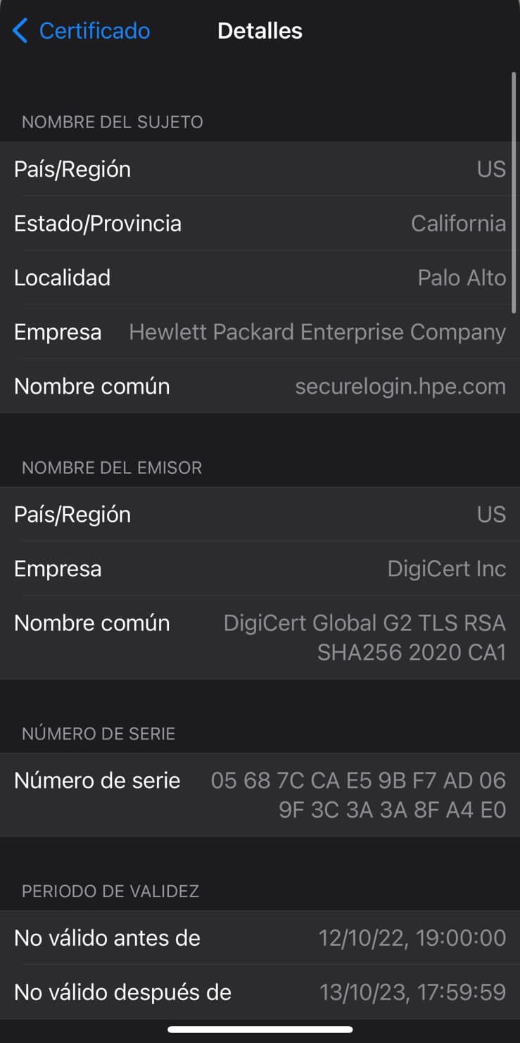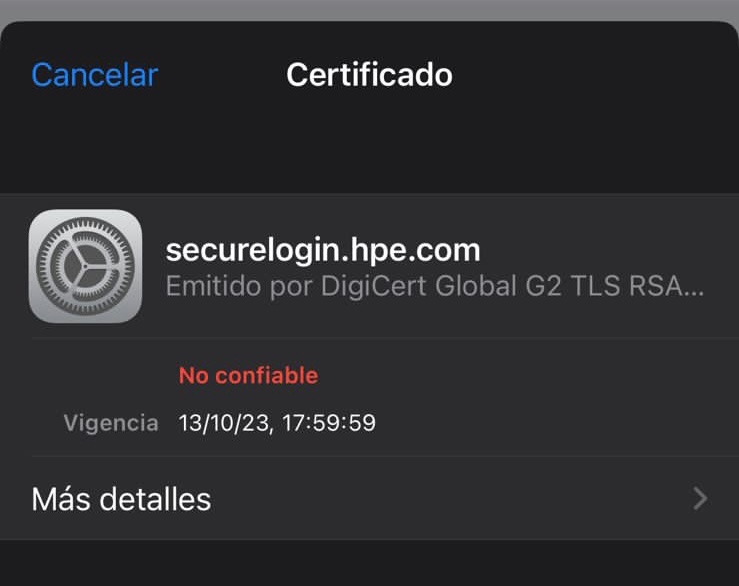 Buenas tardes tengo el siguiente problema con varios IPhone en la familia 12 y 13 nos aparece el siguiente mensaje IMPOSIBLE VERIFICAR IDENTIDAD DEL SERVIDOR y en las pantallas aparece el siguiente certificado SECURELOGIN.HPE.COM. No se puede eliminar, ni aprobar, ya eh buscado en internet y no encuentro solución. Adjunto imágenes. Alguien ya lo pudo solucionar?