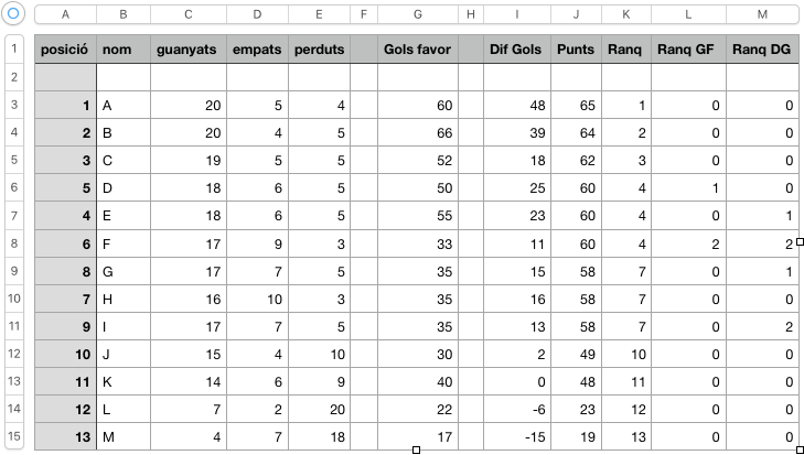 Para la columna M (Ranking Diferencia goles): CONTAR.SI.MÚLTIPLE($J$3:$J$15;J5;$I$3:$I$15;">"&I5)