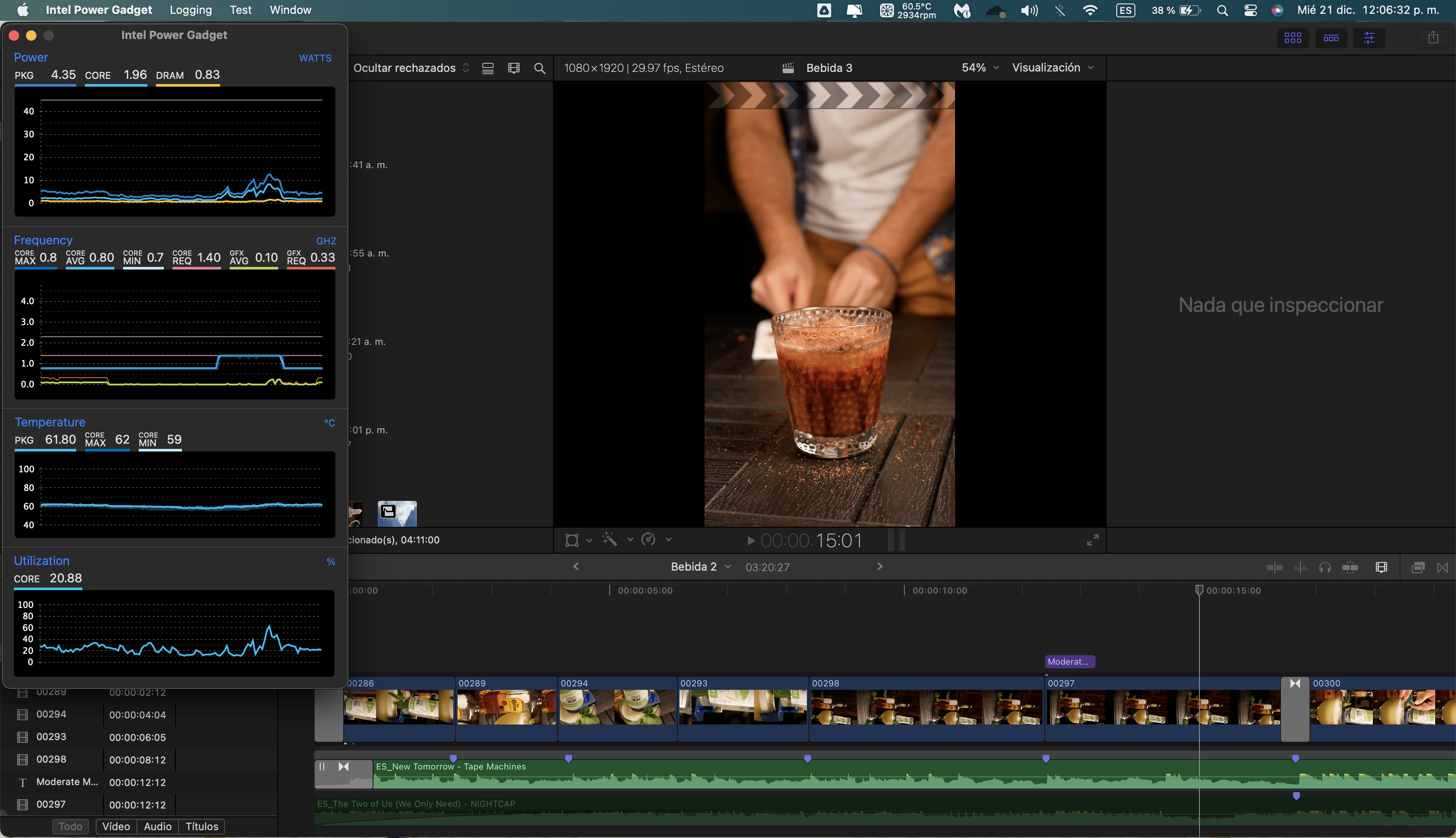 Saludos, tengo uno MacBook Pro de 15 pulgadas del 2019 i9 a 2.3Ghz. El problema es que presenta es que reduce bastante la potencia de la misma cuando hago tareas un poco pesadas, en la imagen que le dejo adjunta estaba trabajando un proyecto en Final Cut en 1080x1920 junto agregué la muestra de Intel Power Gadget, la temperatura está dentro de lo aceptable y el proyecto estaba terminando de renderizar, la mantuve conectada y ahí se puede observar como el procesador esta ¨capado¨. Esto sucede cada vez que hago tareas un poco demandantes.
