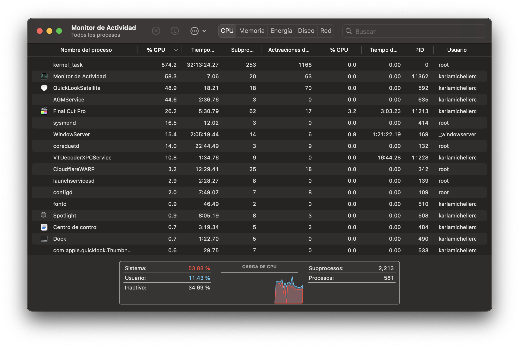 También adjunto esta imagen donde muestra el proceso kernel_task consumiendo gran parte de la capacidad de procesamiento.