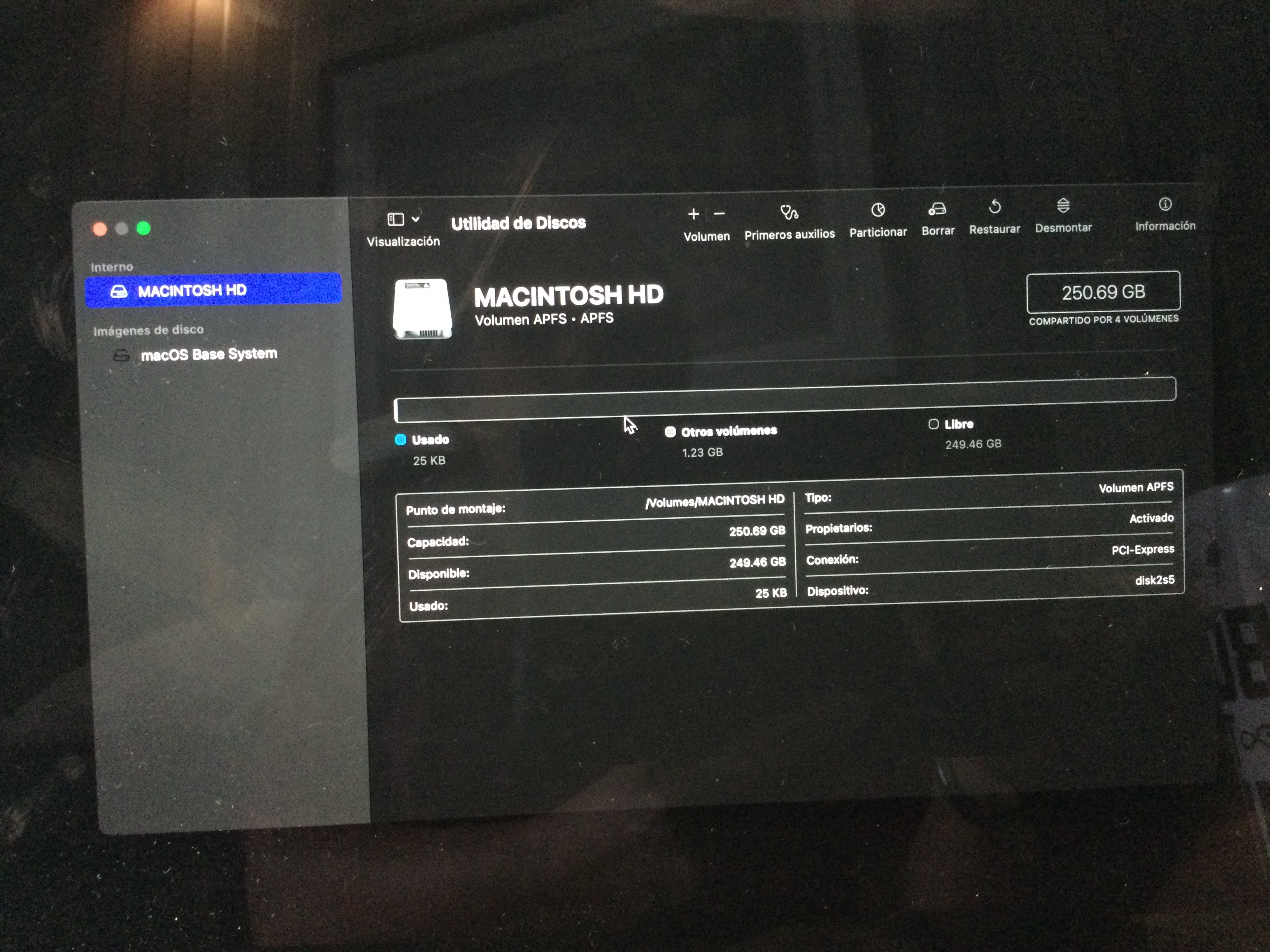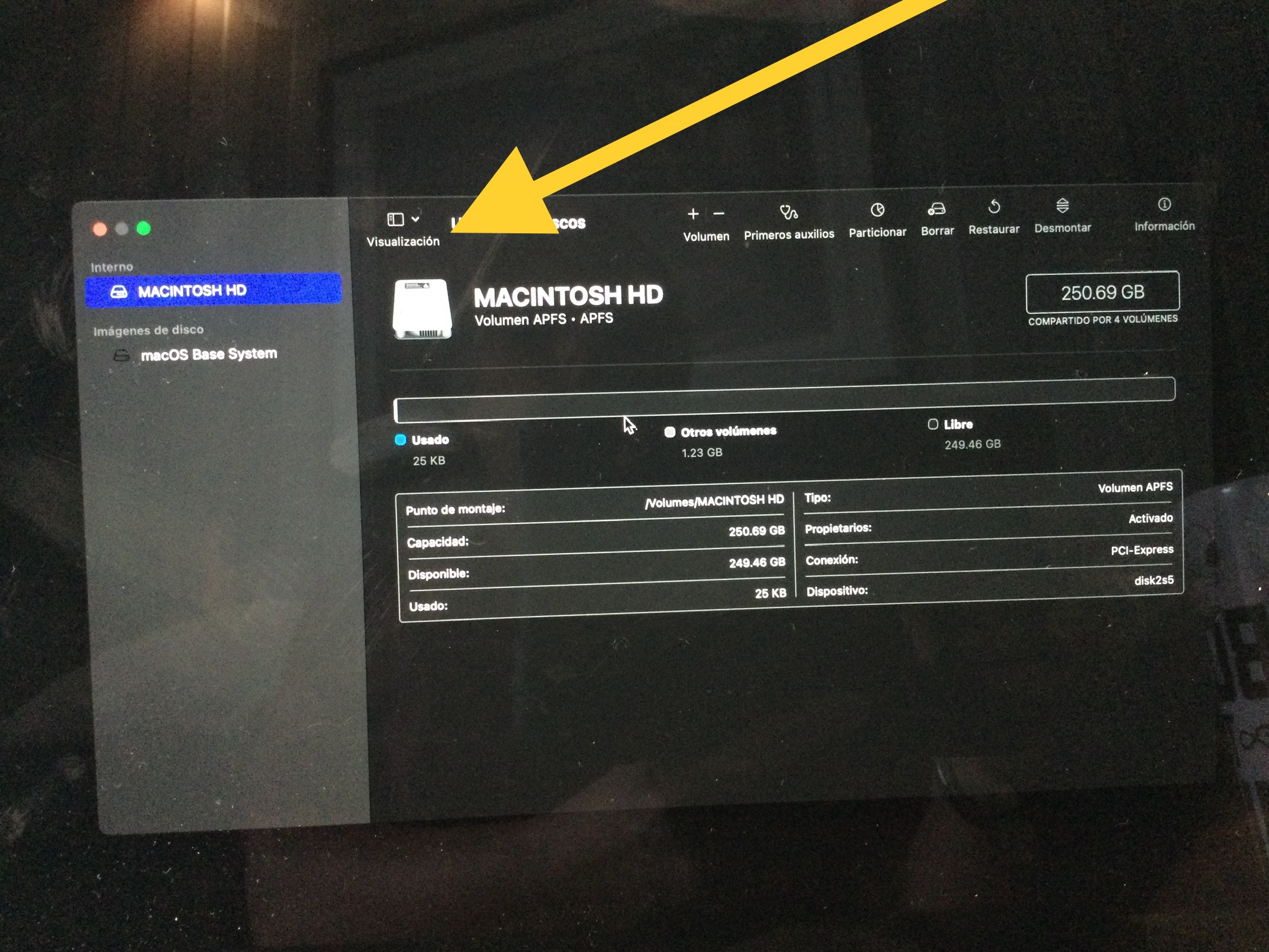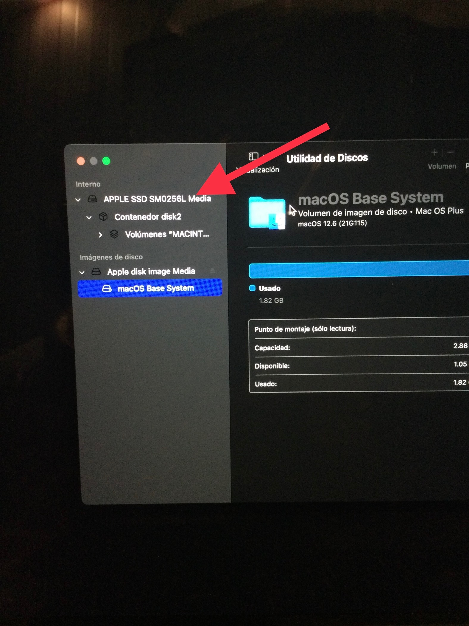 Ok es por la hora que quería saber de donde eres, ok en esa imagen que adjuntare te marque el disco duro con una flecha , seleccionalo y buscas borrar , en la siguiente ventana colocas Macintosh en el nombre , en formato buscas APFS y Esquema deberá decir mapa de particiones Guid , das click en borrar y esperas que termine, cierras ahí y vas a la vfbysjz donde dice reinstalar macOS , si su wifi se desconecta en ese proceso deberá conectarla otra vez