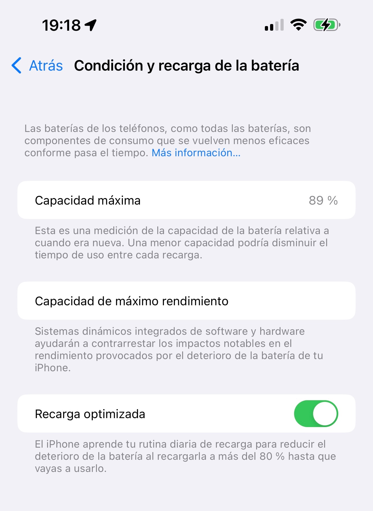 Mi forma de carga es al correcta, utilizando sólo dispositivos MFi como Anker, Mophie o Belkin, y en su mayoría los oficiales de Apple. Es más, mi anterior iPhone, el XS Max aún está al 90% y tiene más de 3 años ya. (misma forma de carga)