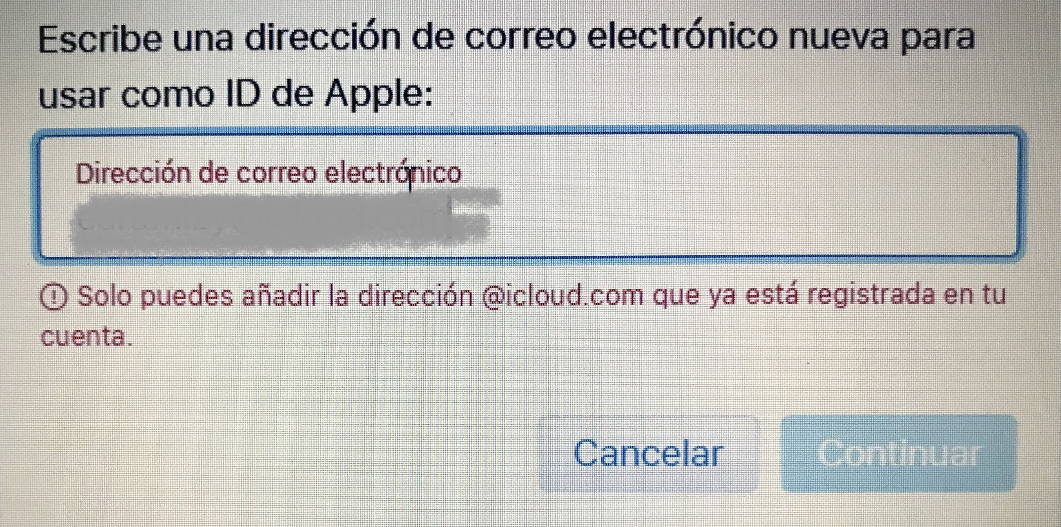 Al momento de crear mi Apple ID lo cree con una cuenta de gmail(@gmail.com) y ahora quiero cambiarlo a icloud(@icloud.com) al dirigirme a la página donde se gestiona el Apple Id, puse editar y cambiar apple Id escribí una dirección de icloud y apareció esto. ¿Qué puedo hacer?