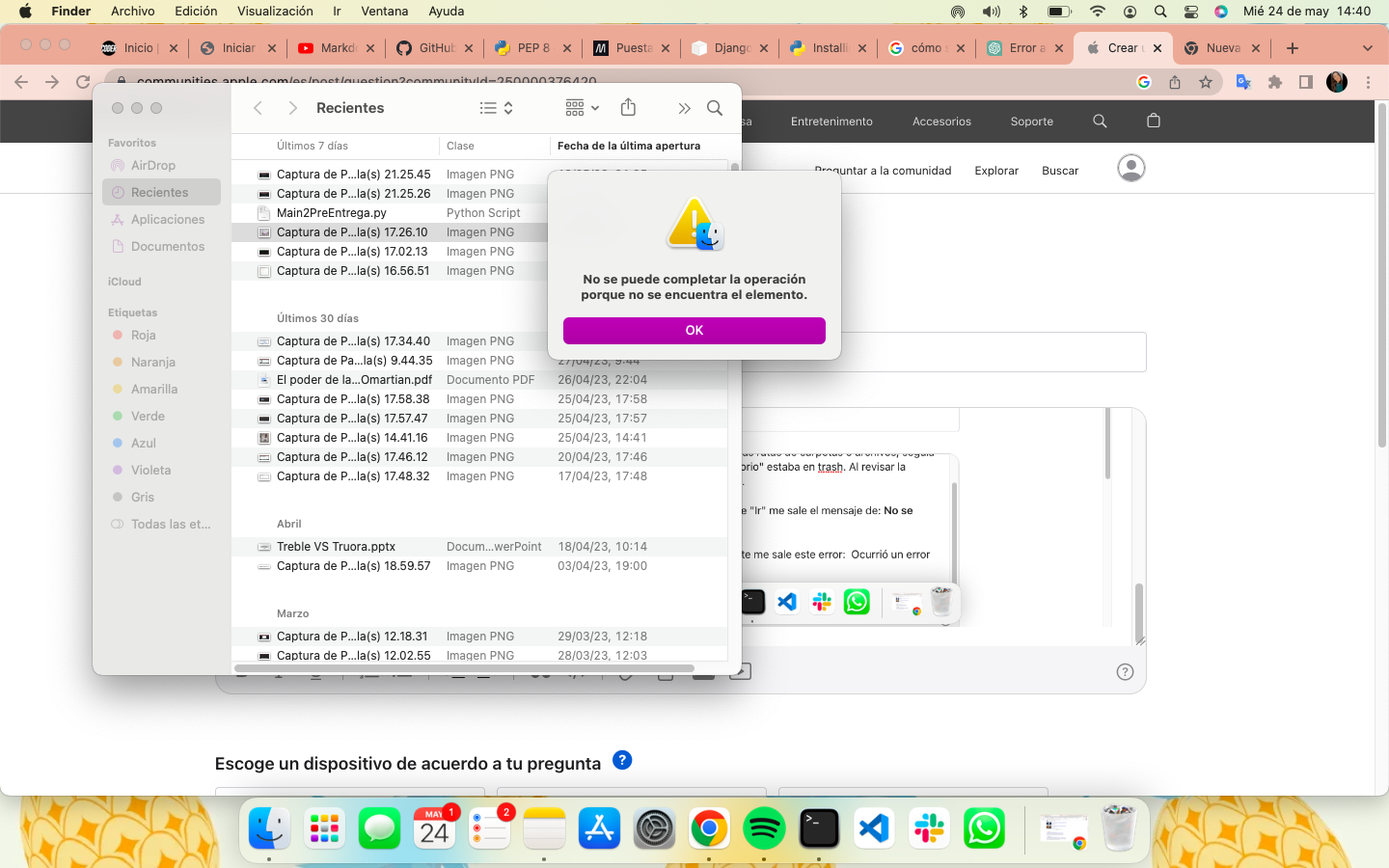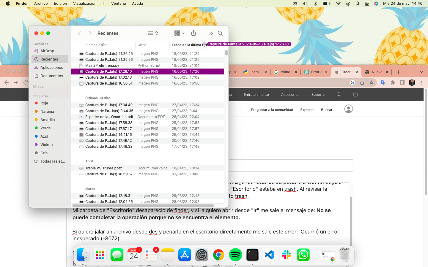 Mi carpeta de "Escritorio" desapareció de finder, y si la quiero abrir desde "Ir" me sale el mensaje de: No se puede completar la operación porque no se encuentra el elemento.