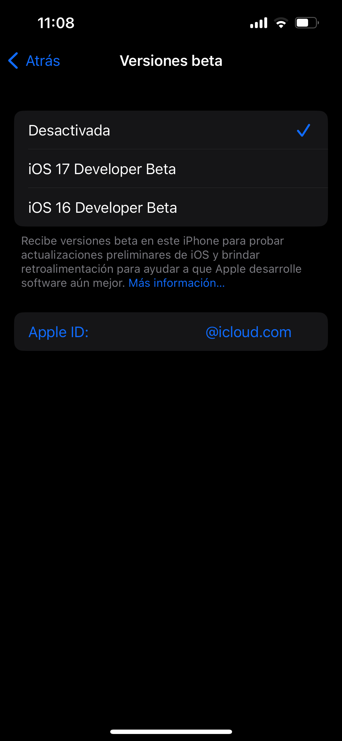 En el caso de lo de las versiones beta, perfectamente, debes mantenerla en la opción desactivadas y no quieres recibir las versiones preliminares de iOS