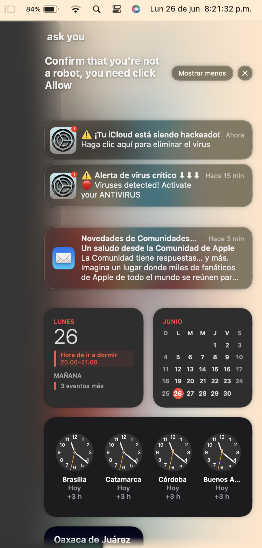 Hola, hace tres días comenzaron a aparecerme este tipo de notificaciones que me dicen que mi Mac está infectada, es una Macbook pro 14, me aparecen en el costado izquierdo superior de mi compu, no sé que hacer, estoy desesperada porque es mi semana de evaluaciones y no quiero que ningún virus me robe mis trabajos y contraseñas, ayuda por favor. ¿Que antivirus me recomiendan o que puedo hacer?